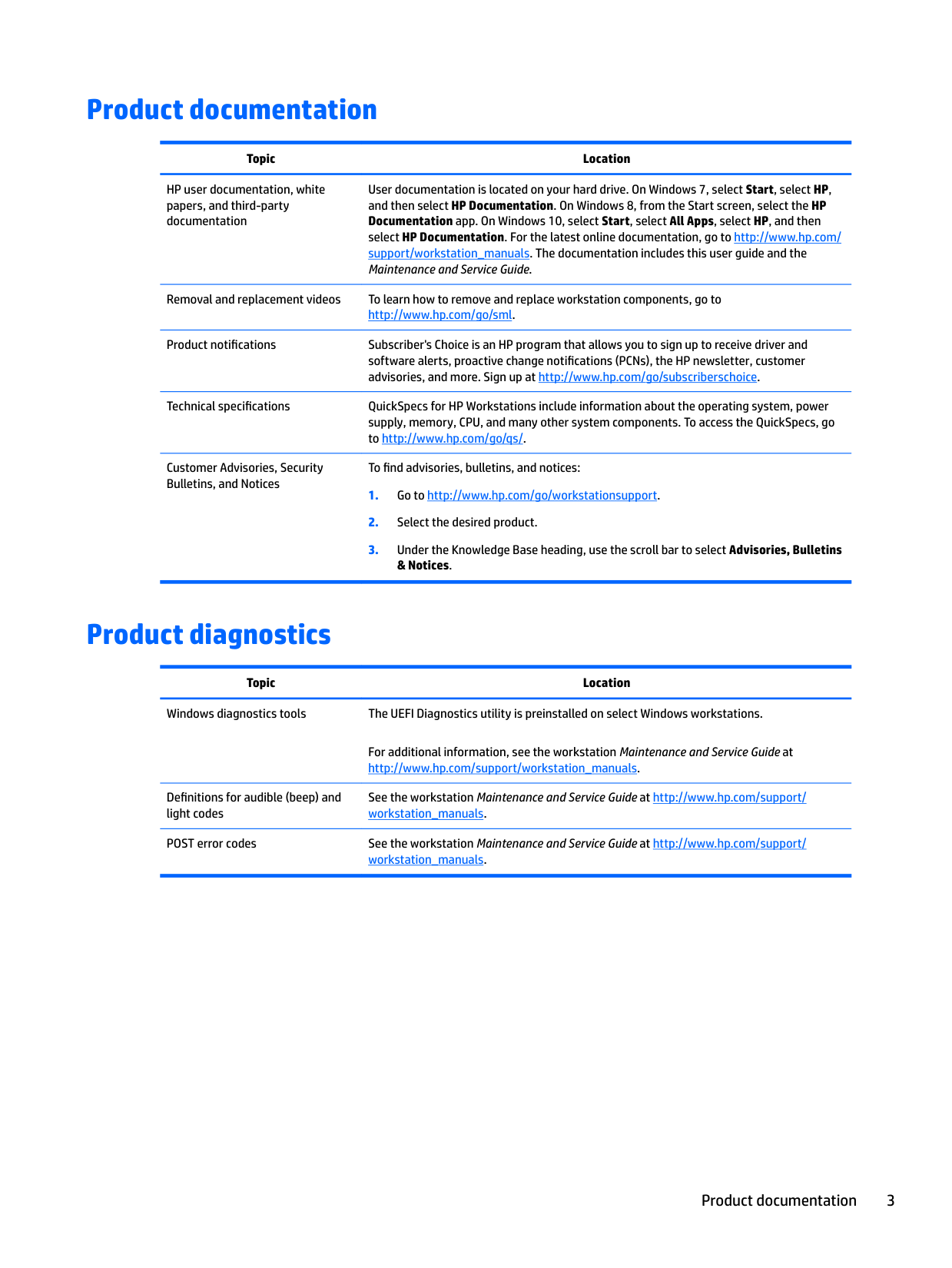 Product documentation Topic Location HP user documentation, white papers, and third-party documentation User documentation is located on your hard drive. On Windows 7, select Start, select HP, and then select HP Documentation. On Windows 8, from the Start screen, select the HP Documentation app. On Windows 10, select Start, select All Apps, select HP, and then select HP Documentation. For the latest online documentation, go to http://www.hp.com/ support/workstation_manuals. The documentation includes this user guide and the Maintenance and Service Guide. Removal and replacement videos To learn how to remove and replace workstation components, go to http://www.hp.com/go/sml. Product notifications Subscriber's Choice is an HP program that allows you to sign up to receive driver and software alerts, proactive change notifications (PCNs), the HP newsletter, customer advisories, and more. Sign up at http://www.hp.com/go/subscriberschoice. Technical specifications QuickSpecs for HP Workstations include information about the operating system, power supply, memory, CPU, and many other system components. To access the QuickSpecs, go to http://www.hp.com/go/qs/. Customer Advisories, Security Bulletins, and Notices To find advisories, bulletins, and notices: