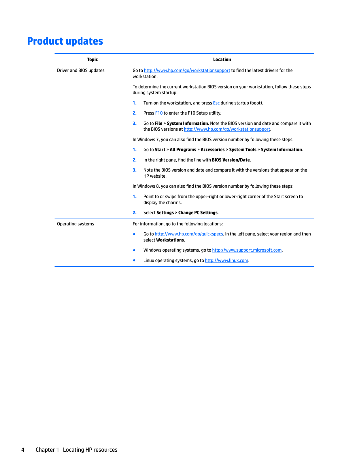 Product updates Topic Location Driver and BIOS updates Go to http://www.hp.com/go/workstationsupport to find the latest drivers for the workstation. To determine the current workstation BIOS version on your workstation, follow these steps during system startup: