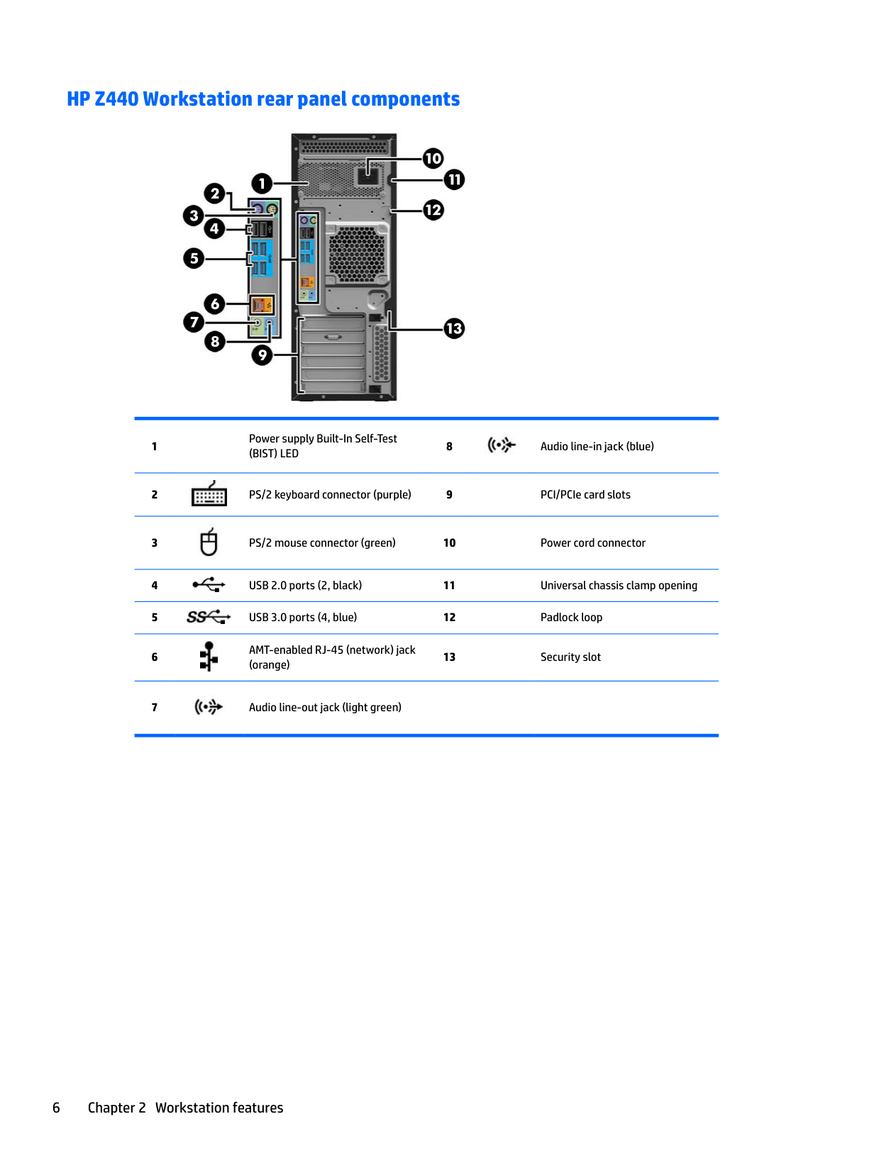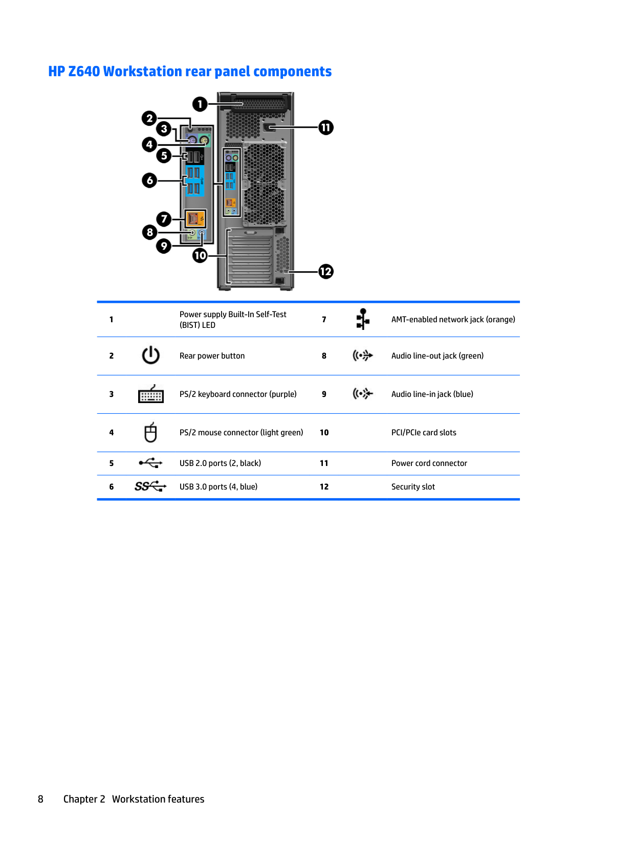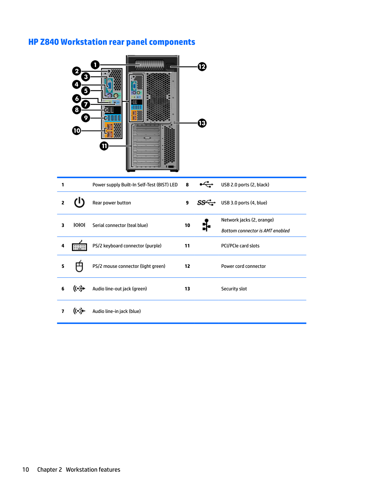 Power supply Built-In Self-Test (BIST) LED 8 USB 2.0 ports (2, black) 2 Rear power button 9 USB 3.0 ports (4, blue) 3 Serial connector (teal blue) 10 Network jacks (2, orange) Bottom connector is AMT enabled 4 PS/2 keyboard connector (purple) 11