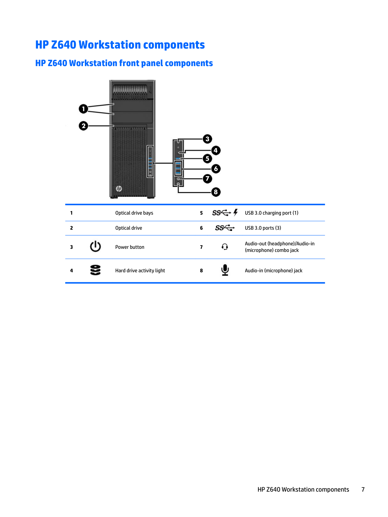 Optical drive 6 USB 3.0 ports (3) 3 Power button 7 Audio-out (headphone)/Audio-in (microphone) combo jack 4 Hard drive activity light 8 Audio-in (microphone) jack HP Z640 Workstation components 7