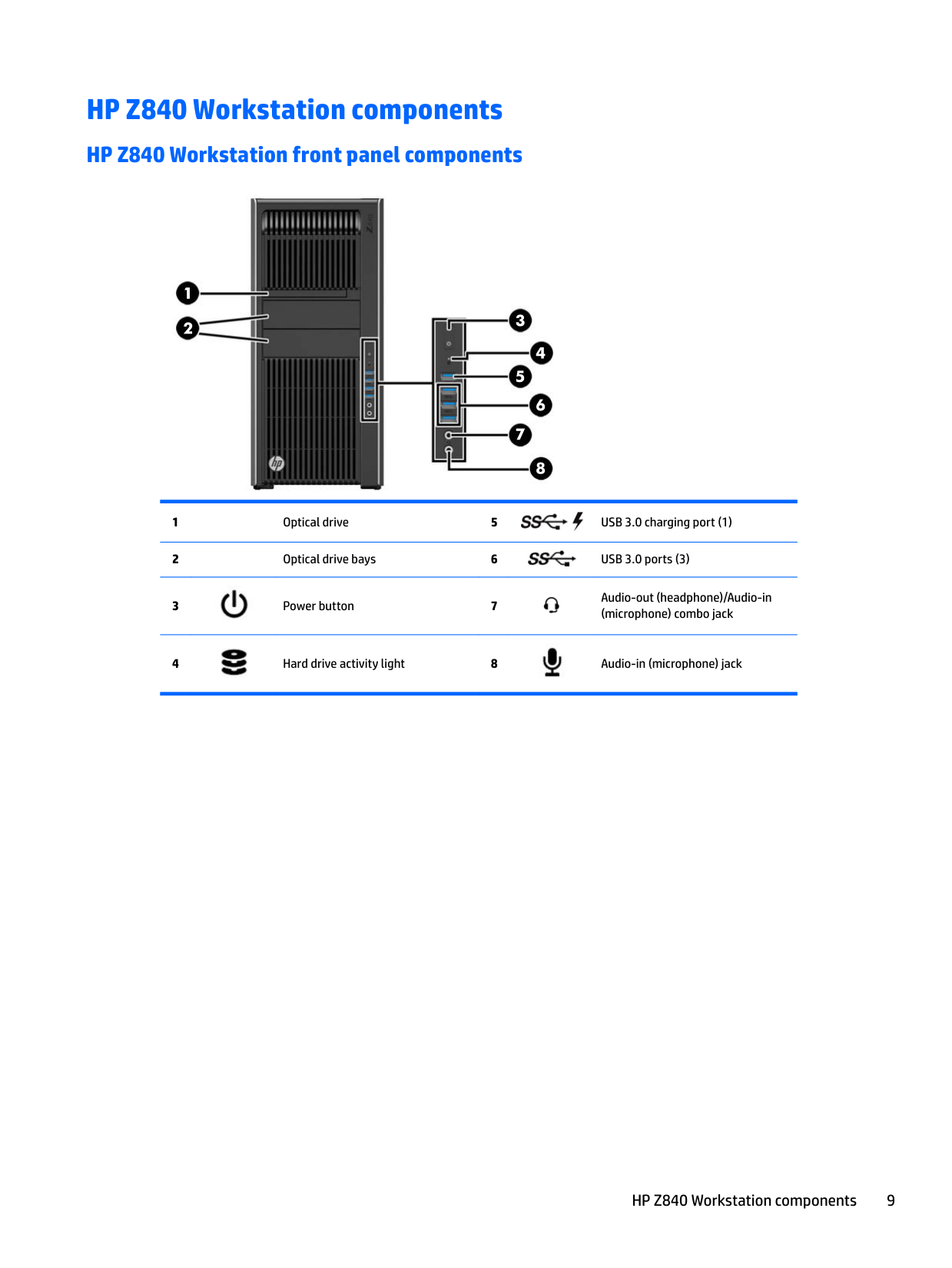 Optical drive bays 6 USB 3.0 ports (3) 3 Power button 7 Audio-out (headphone)/Audio-in (microphone) combo jack 4 Hard drive activity light 8 Audio-in (microphone) jack HP Z840 Workstation components 9
