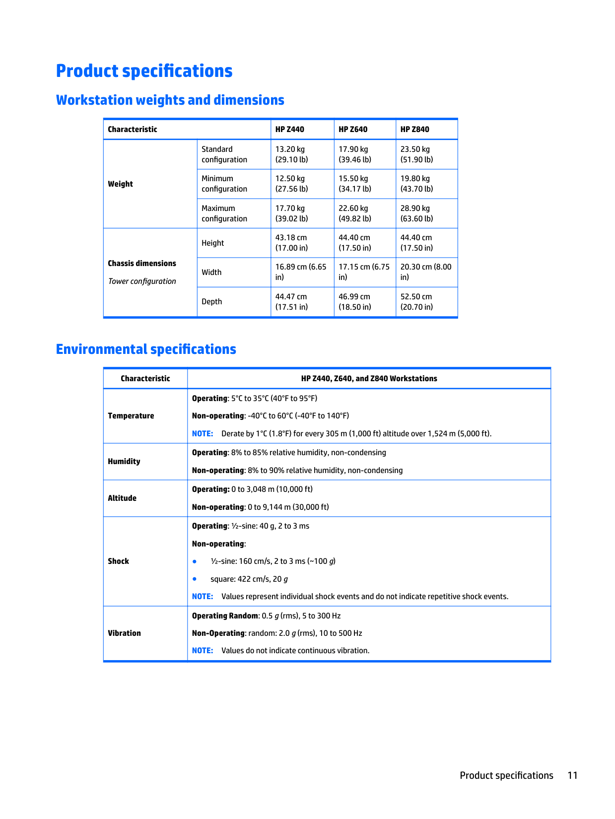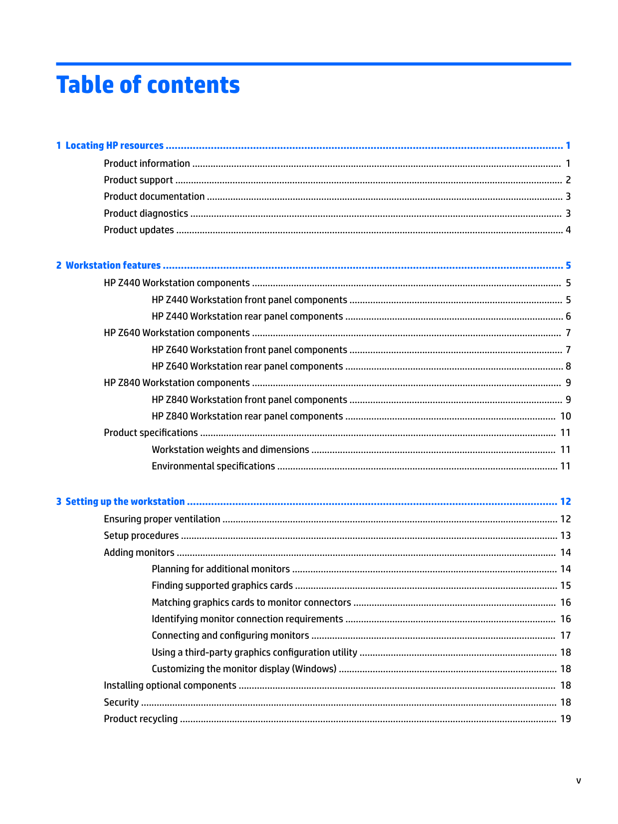 If you do not find what you are looking for in this guide: — Find technical details in the Maintenance and Service Guide for your workstation at http://www.hp.com/ support/workstation_manuals. — View component installation videos at http://www.hp.com/go/sml. — See additional information on your workstation at http://www.hp.com/go/workstations. iiiTable of contents 1 Locating HP resources .................................................................................................................................... 1 Product information .............................................................................................................................................. 1 Product support ..................................................................................................................................................... 2 Product documentation ......................................................................................................................................... 3 Product diagnostics ............................................................................................................................................... 3 Product updates ..................................................................................................................................................... 4 2 Workstation features ..................................................................................................................................... 5 HP Z440 Workstation components ....................................................................................................................... 5 HP Z440 Workstation front panel components .................................................................................. 5 HP Z440 Workstation rear panel components .................................................................................... 6 HP Z640 Workstation components ....................................................................................................................... 7 HP Z640 Workstation front panel components .................................................................................. 7 HP Z640 Workstation rear panel components .................................................................................... 8 HP Z840 Workstation components ....................................................................................................................... 9 HP Z840 Workstation front panel components .................................................................................. 9 HP Z840 Workstation rear panel components ................................................................................. 10 Product specifications ......................................................................................................................................... 11 Workstation weights and dimensions .............................................................................................. 11 Environmental specifications ............................................................................................................ 11 3 Setting up the workstation ........................................................................................................................... 12 Ensuring proper ventilation ................................................................................................................................. 12 Setup procedures ................................................................................................................................................. 13 Adding monitors .................................................................................................................................................. 14 Planning for additional monitors ...................................................................................................... 14 Finding supported graphics cards ..................................................................................................... 15 Matching graphics cards to monitor connectors .............................................................................. 16 Identifying monitor connection requirements ................................................................................. 16 Connecting and configuring monitors .............................................................................................. 17 Using a third-party graphics configuration utility ............................................................................ 18 Customizing the monitor display (Windows) .................................................................................... 18 Installing optional components .......................................................................................................................... 18 Security ................................................................................................................................................................ 18 Product recycling ................................................................................................................................................. 19 v