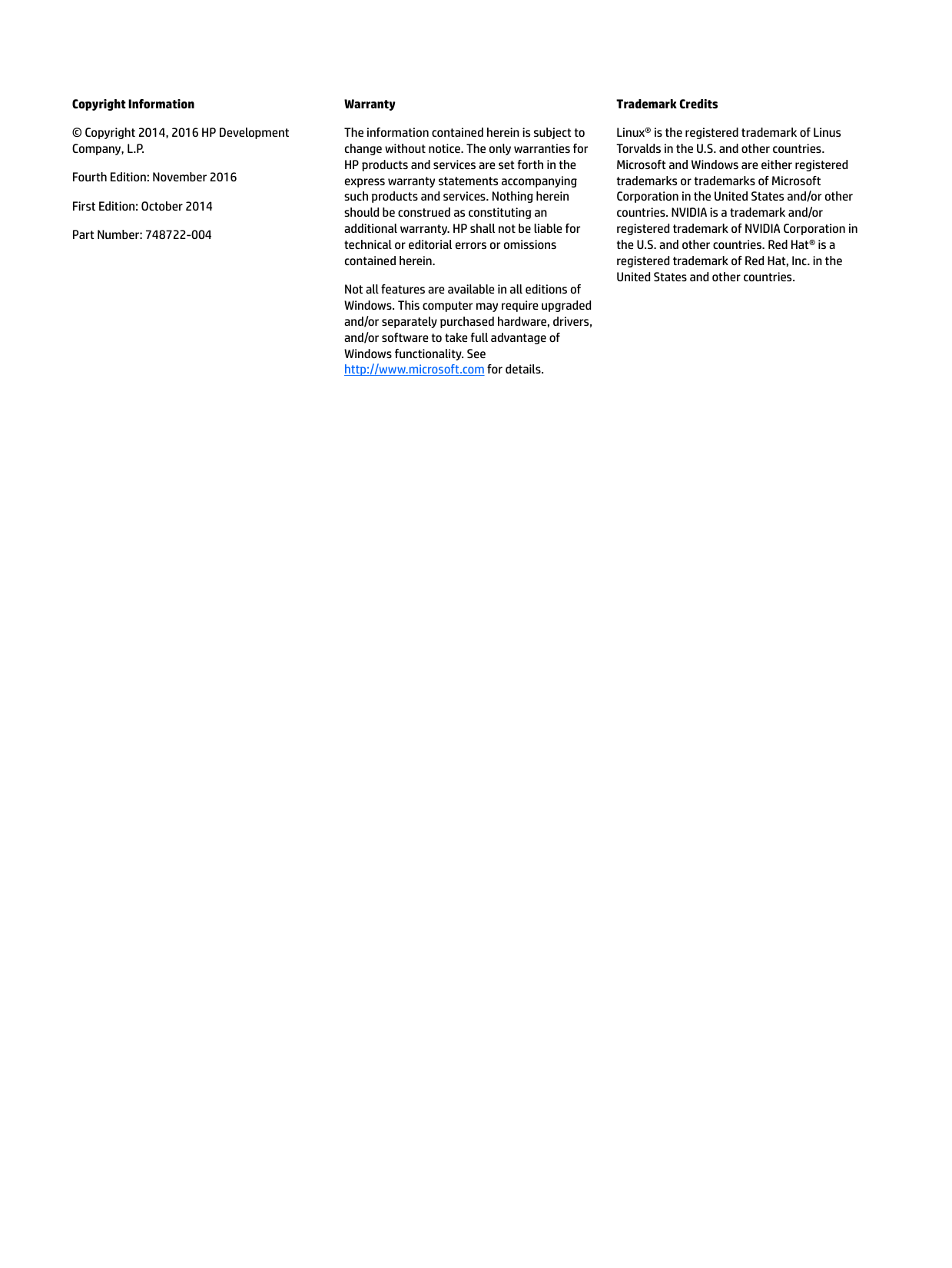 Copyright Information © Copyright 2014, 2016 HP Development Company, L.P. Fourth Edition: November 2016 First Edition: October 2014 Part Number: 748722-004 Warranty The information contained herein is subject to change without notice. The only warranties for HP products and services are set forth in the express warranty statements accompanying such products and services. Nothing herein should be construed as constituting an additional warranty. HP shall not be liable for technical or editorial errors or omissions contained herein. Not all features are available in all editions of Windows. This computer may require upgraded and/or separately purchased hardware, drivers, and/or software to take full advantage of Windows functionality. See http://www.microsoft.com for details. Trademark Credits Linux® is the registered trademark of Linus Torvalds in the U.S. and other countries. Microsoft and Windows are either registered trademarks or trademarks of Microsoft Corporation in the United States and/or other countries. NVIDIA is a trademark and/or registered trademark of NVIDIA Corporation in the U.S. and other countries. Red Hat® is a registered trademark of Red Hat, Inc. in the United States and other countries.
