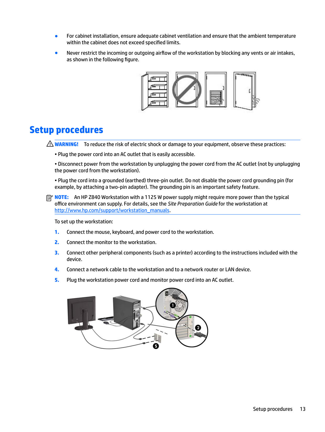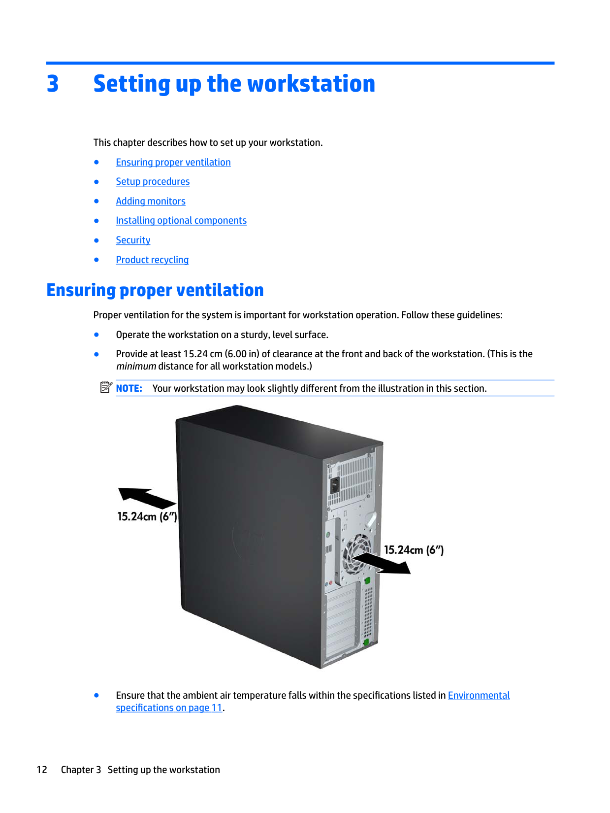 The workstation requires at least 15.24 cm (6.00 in) of clearance at the front and back of the workstation. You should also ensure the ambient air temperature falls within the specified environmental limits, and never block any vents or air intakes. (Page 12)