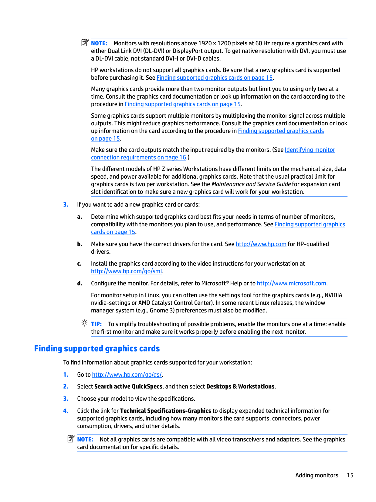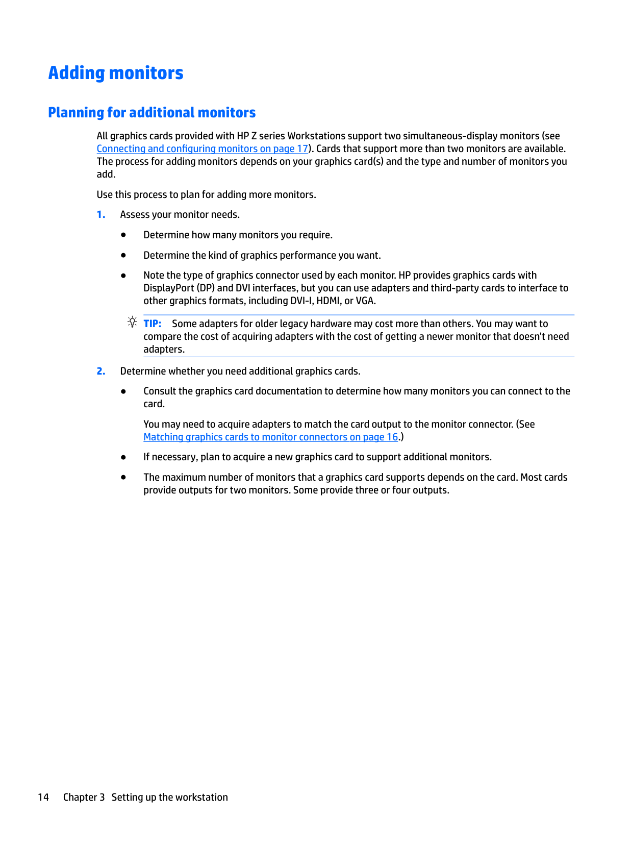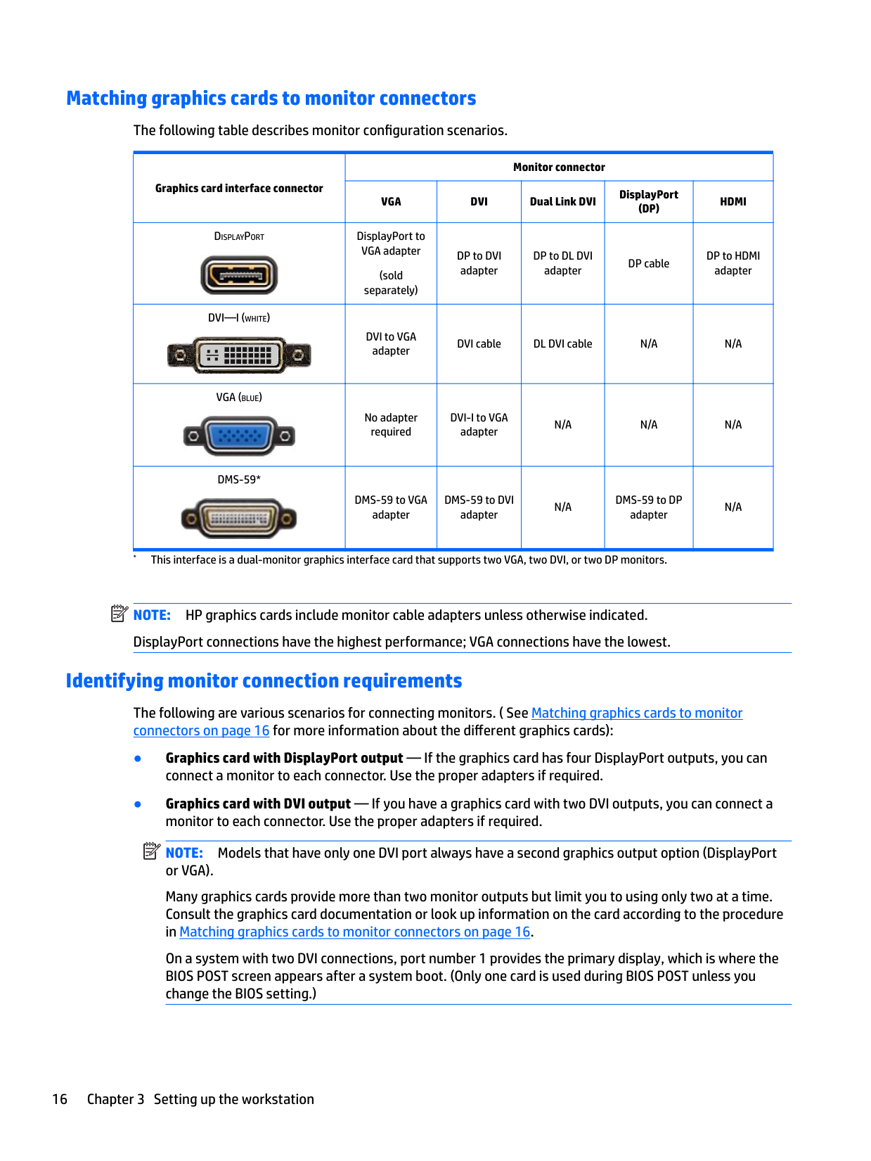 HP graphics cards include monitor cable adapters unless otherwise indicated. DisplayPort connections have the highest performance; VGA connections have the lowest. Identifying monitor connection requirements The following are various scenarios for connecting monitors. ( See Matching graphics cards to monitor connectors on page 16 for more information about the different graphics cards): ● Graphics card with DisplayPort output — If the graphics card has four DisplayPort outputs, you can connect a monitor to each connector. Use the proper adapters if required. ● Graphics card with DVI output — If you have a graphics card with two DVI outputs, you can connect a monitor to each connector. Use the proper adapters if required.Note: