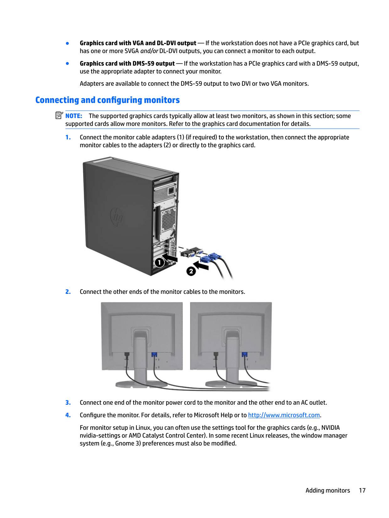Models that have only one DVI port always have a second graphics output option (DisplayPort or VGA). Many graphics cards provide more than two monitor outputs but limit you to using only two at a time. Consult the graphics card documentation or look up information on the card according to the procedure in Matching graphics cards to monitor connectors on page 16. On a system with two DVI connections, port number 1 provides the primary display, which is where the BIOS POST screen appears after a system boot. (Only one card is used during BIOS POST unless you change the BIOS setting.) 16 Chapter 3 Setting up the workstation● Graphics card with VGA and DL-DVI output — If the workstation does not have a PCIe graphics card, but has one or more SVGA and/or DL-DVI outputs, you can connect a monitor to each output. ● Graphics card with DMS-59 output — If the workstation has a PCIe graphics card with a DMS-59 output, use the appropriate adapter to connect your monitor. Adapters are available to connect the DMS-59 output to two DVI or two VGA monitors. Connecting and configuring monitors