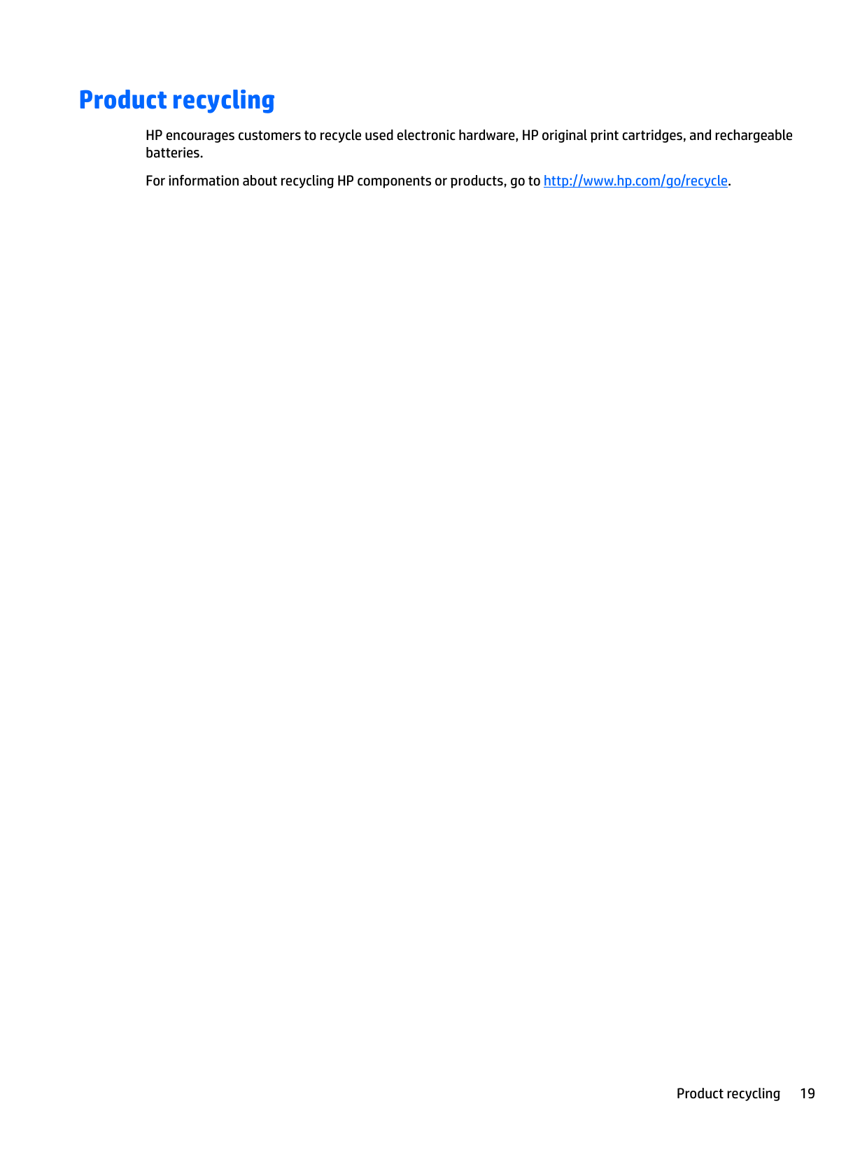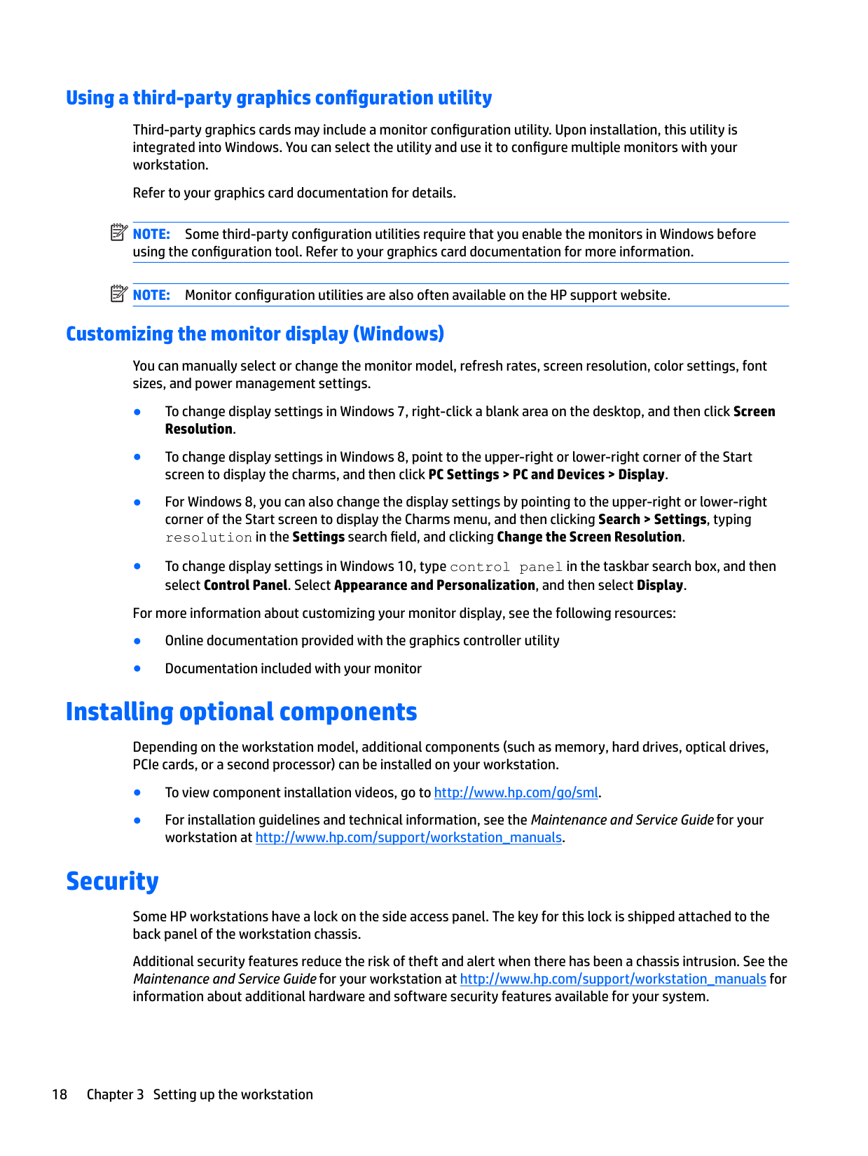 Monitor configuration utilities are also often available on the HP support website. Customizing the monitor display (Windows) You can manually select or change the monitor model, refresh rates, screen resolution, color settings, font sizes, and power management settings. ● To change display settings in Windows 7, right-click a blank area on the desktop, and then click Screen Resolution. ● To change display settings in Windows 8, point to the upper-right or lower-right corner of the Start screen to display the charms, and then click PC Settings > PC and Devices > Display. ● For Windows 8, you can also change the display settings by pointing to the upper-right or lower-right corner of the Start screen to display the Charms menu, and then clicking Search > Settings, typing resolution in the Settings search field, and clicking Change the Screen Resolution. ● To change display settings in Windows 10, type control panel in the taskbar search box, and then select Control Panel. Select Appearance and Personalization, and then select Display. For more information about customizing your monitor display, see the following resources: ● Online documentation provided with the graphics controller utility ● Documentation included with your monitor Installing optional components Depending on the workstation model, additional components (such as memory, hard drives, optical drives, PCIe cards, or a second processor) can be installed on your workstation. ● To view component installation videos, go to http://www.hp.com/go/sml. ● For installation guidelines and technical information, see the Maintenance and Service Guide for your workstation at http://www.hp.com/support/workstation_manuals. Security Some HP workstations have a lock on the side access panel. The key for this lock is shipped attached to the back panel of the workstation chassis. Additional security features reduce the risk of theft and alert when there has been a chassis intrusion. See the Maintenance and Service Guide for your workstation at http://www.hp.com/support/workstation_manuals for information about additional hardware and software security features available for your system. 18 Chapter 3 Setting up the workstationProduct recycling HP encourages customers to recycle used electronic hardware, HP original print cartridges, and rechargeable batteries. For information about recycling HP components or products, go to http://www.hp.com/go/recycle. Product recycling 19