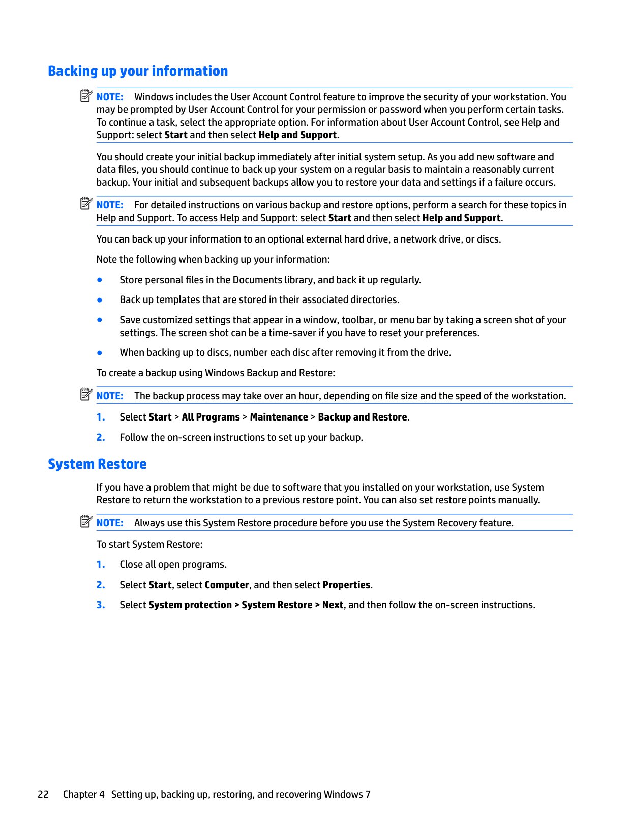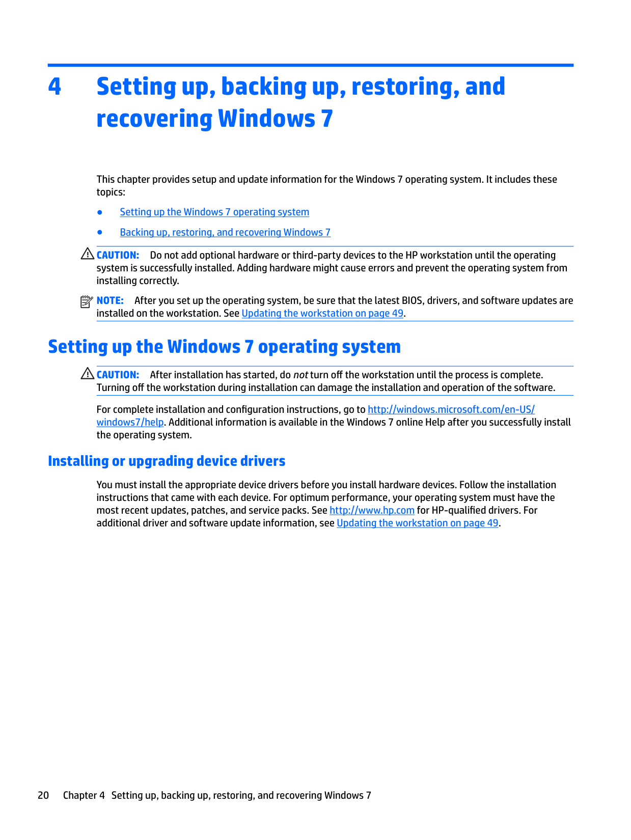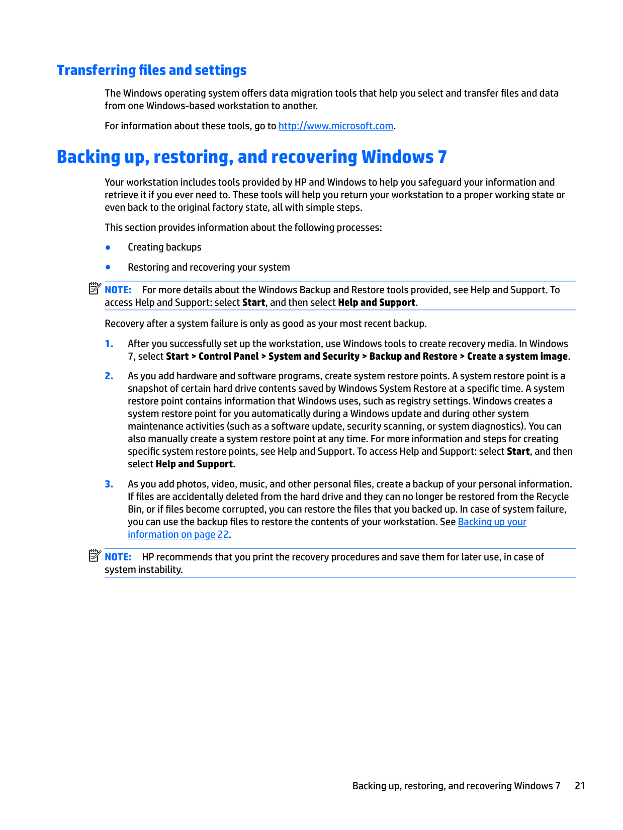 After installation has started, do not turn off the workstation until the process is complete. Turning off the workstation during installation can damage the installation and operation of the software. For complete installation and configuration instructions, go to http://windows.microsoft.com/en-US/ windows7/help. Additional information is available in the Windows 7 online Help after you successfully install the operating system. Installing or upgrading device drivers You must install the appropriate device drivers before you install hardware devices. Follow the installation instructions that came with each device. For optimum performance, your operating system must have the most recent updates, patches, and service packs. See http://www.hp.com for HP-qualified drivers. For additional driver and software update information, see Updating the workstation on page 49. 20 Chapter 4 Setting up, backing up, restoring, and recovering Windows 7Transferring files and settings The Windows operating system offers data migration tools that help you select and transfer files and data from one Windows-based workstation to another. For information about these tools, go to http://www.microsoft.com. Backing up, restoring, and recovering Windows 7 Your workstation includes tools provided by HP and Windows to help you safeguard your information and retrieve it if you ever need to. These tools will help you return your workstation to a proper working state or even back to the original factory state, all with simple steps. This section provides information about the following processes: ● Creating backups ● Restoring and recovering your system