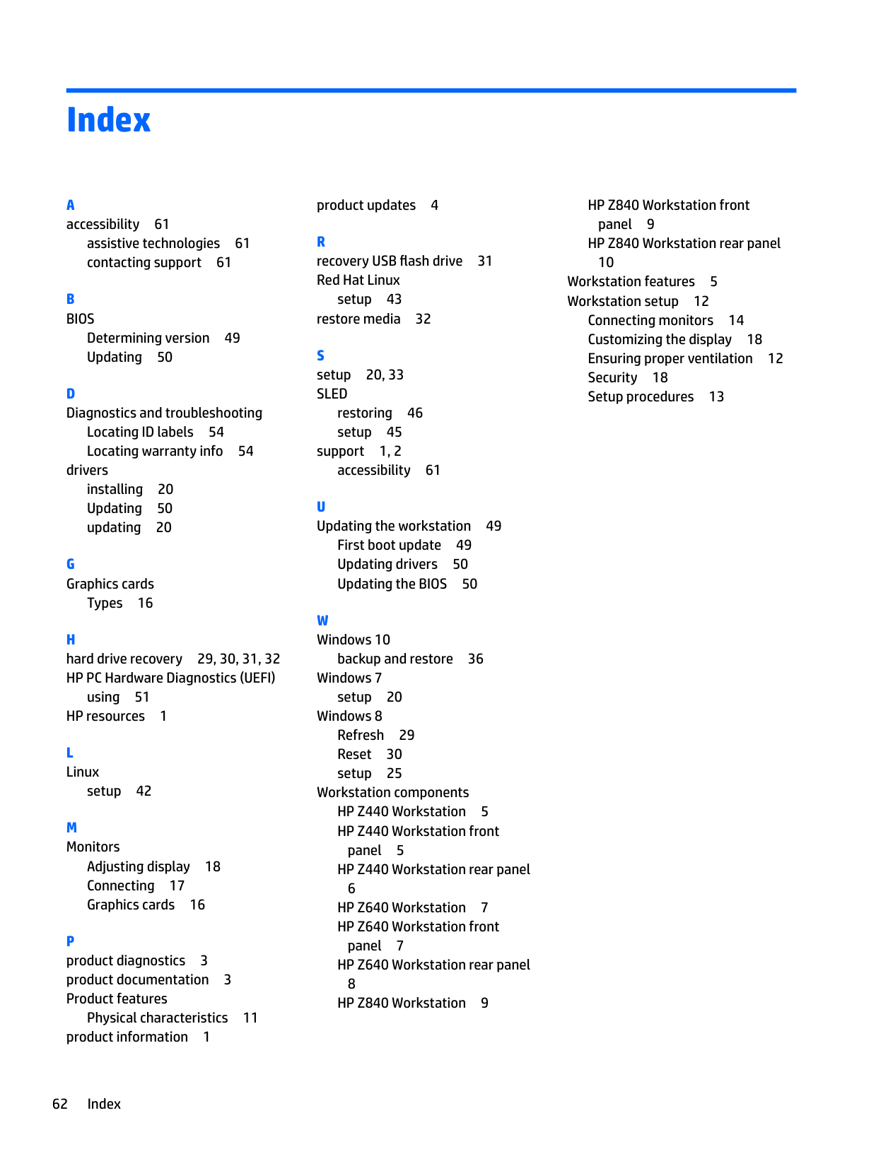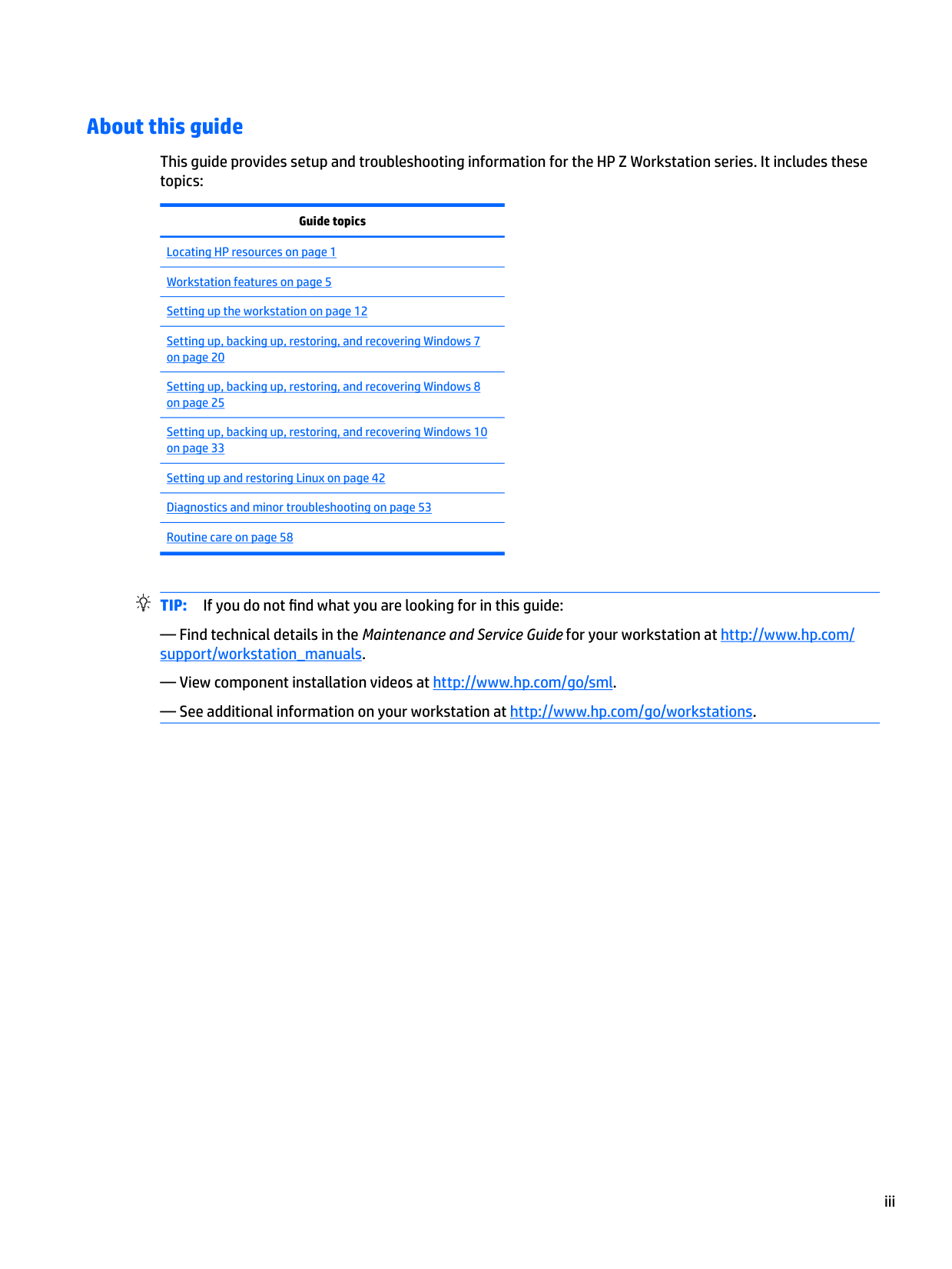 About this guide This guide provides setup and troubleshooting information for the HP Z Workstation series. It includes these topics: Guide topics Locating HP resources on page 1 Workstation features on page 5 Setting up the workstation on page 12 Setting up, backing up, restoring, and recovering Windows 7 on page 20 Setting up, backing up, restoring, and recovering Windows 8 on page 25 Setting up, backing up, restoring, and recovering Windows 10 on page 33 Setting up and restoring Linux on page 42 Diagnostics and minor troubleshooting on page 53 Routine care on page 58