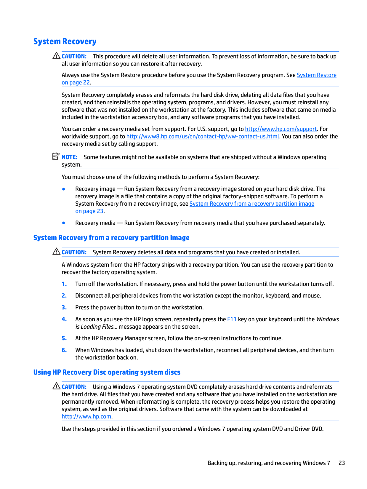 This procedure will delete all user information. To prevent loss of information, be sure to back up all user information so you can restore it after recovery. Always use the System Restore procedure before you use the System Recovery program. See System Restore on page 22. System Recovery completely erases and reformats the hard disk drive, deleting all data files that you have created, and then reinstalls the operating system, programs, and drivers. However, you must reinstall any software that was not installed on the workstation at the factory. This includes software that came on media included in the workstation accessory box, and any software programs that you have installed. You can order a recovery media set from support. For U.S. support, go to http://www.hp.com/support. For worldwide support, go to http://www8.hp.com/us/en/contact-hp/ww-contact-us.html. You can also order the recovery media set by calling support.Note: