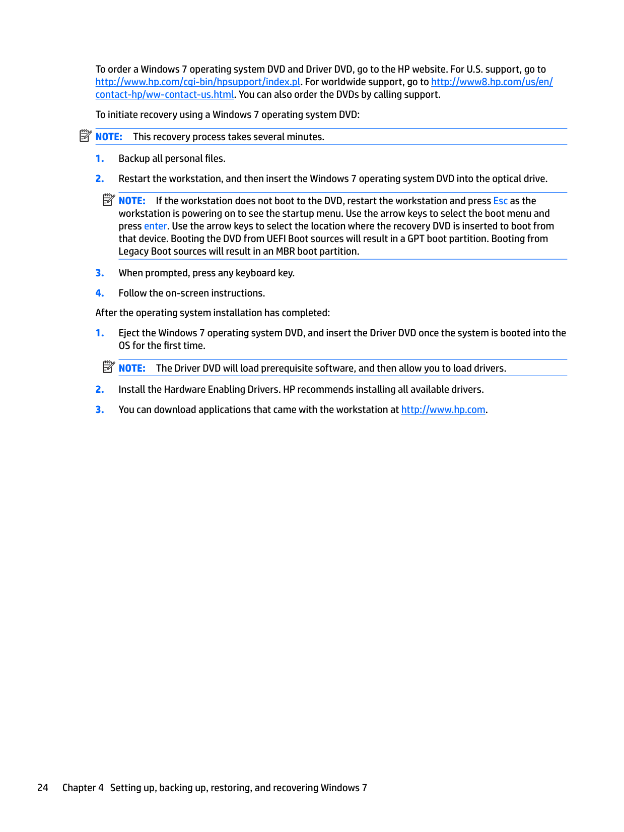 Using a Windows 7 operating system DVD completely erases hard drive contents and reformats the hard drive. All files that you have created and any software that you have installed on the workstation are permanently removed. When reformatting is complete, the recovery process helps you restore the operating system, as well as the original drivers. Software that came with the system can be downloaded at http://www.hp.com. Use the steps provided in this section if you ordered a Windows 7 operating system DVD and Driver DVD. Backing up, restoring, and recovering Windows 7 23To order a Windows 7 operating system DVD and Driver DVD, go to the HP website. For U.S. support, go to http://www.hp.com/cgi-bin/hpsupport/index.pl. For worldwide support, go to http://www8.hp.com/us/en/ contact-hp/ww-contact-us.html. You can also order the DVDs by calling support. To initiate recovery using a Windows 7 operating system DVD:
