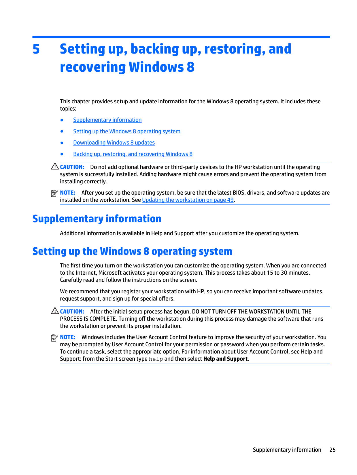 After you set up the operating system, be sure that the latest BIOS, drivers, and software updates are installed on the workstation. See Updating the workstation on page 49. Supplementary information Additional information is available in Help and Support after you customize the operating system. Setting up the Windows 8 operating system The first time you turn on the workstation you can customize the operating system. When you are connected to the Internet, Microsoft activates your operating system. This process takes about 15 to 30 minutes. Carefully read and follow the instructions on the screen. We recommend that you register your workstation with HP, so you can receive important software updates, request support, and sign up for special offers.Caution: