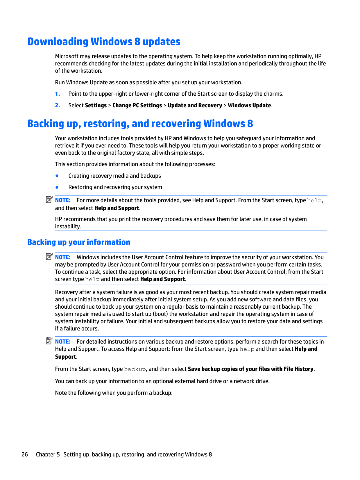 For more details about the tools provided, see Help and Support. From the Start screen, type help, and then select Help and Support. HP recommends that you print the recovery procedures and save them for later use, in case of system instability. Backing up your informationNote: