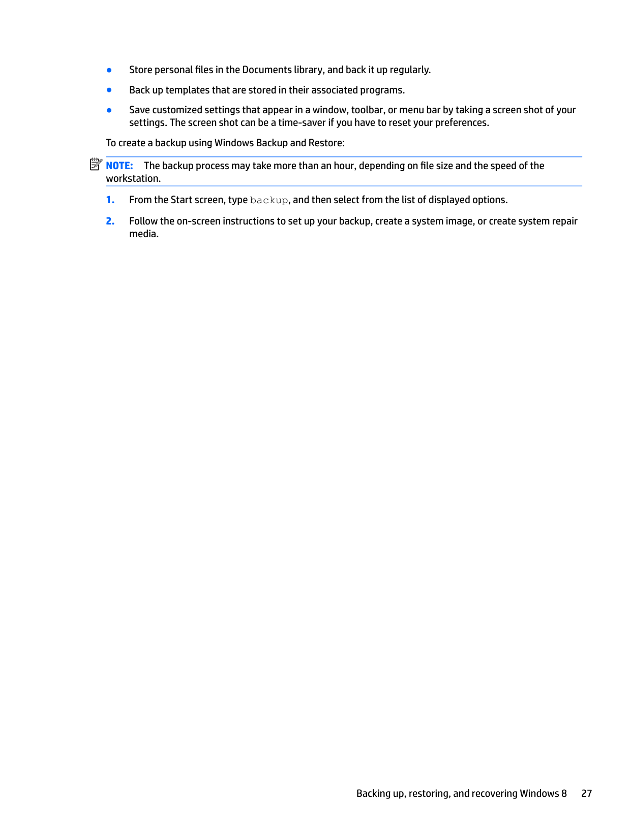 For detailed instructions on various backup and restore options, perform a search for these topics in Help and Support. To access Help and Support: from the Start screen, type help and then select Help and Support. From the Start screen, type backup, and then select Save backup copies of your files with File History. You can back up your information to an optional external hard drive or a network drive. Note the following when you perform a backup: 26 Chapter 5 Setting up, backing up, restoring, and recovering Windows 8● Store personal files in the Documents library, and back it up regularly. ● Back up templates that are stored in their associated programs. ● Save customized settings that appear in a window, toolbar, or menu bar by taking a screen shot of your settings. The screen shot can be a time-saver if you have to reset your preferences. To create a backup using Windows Backup and Restore: