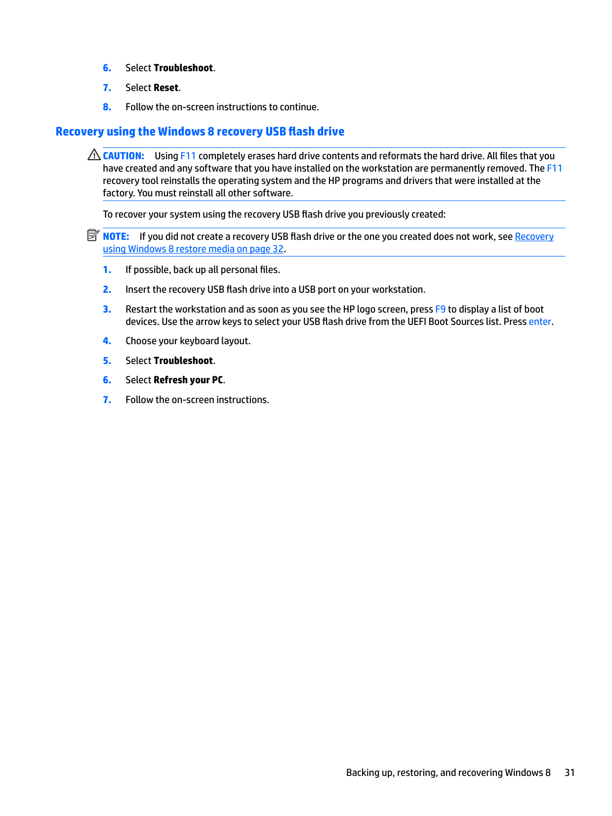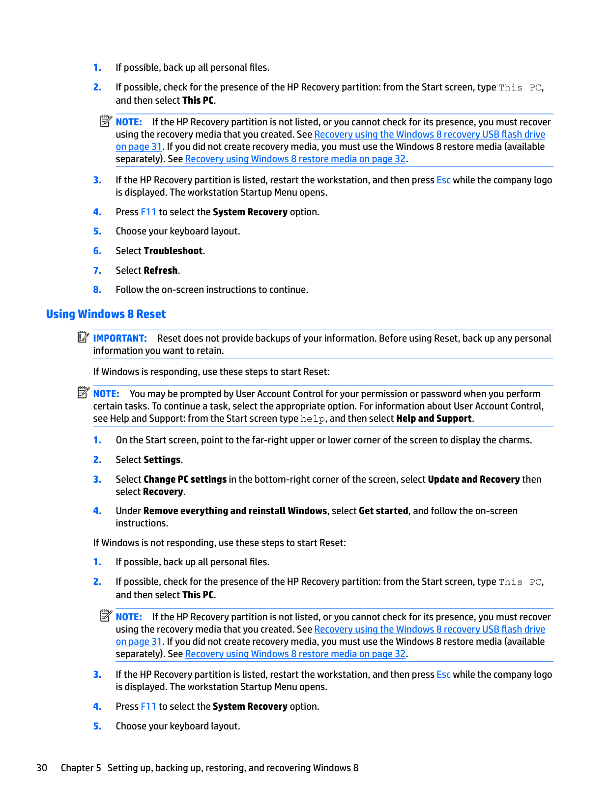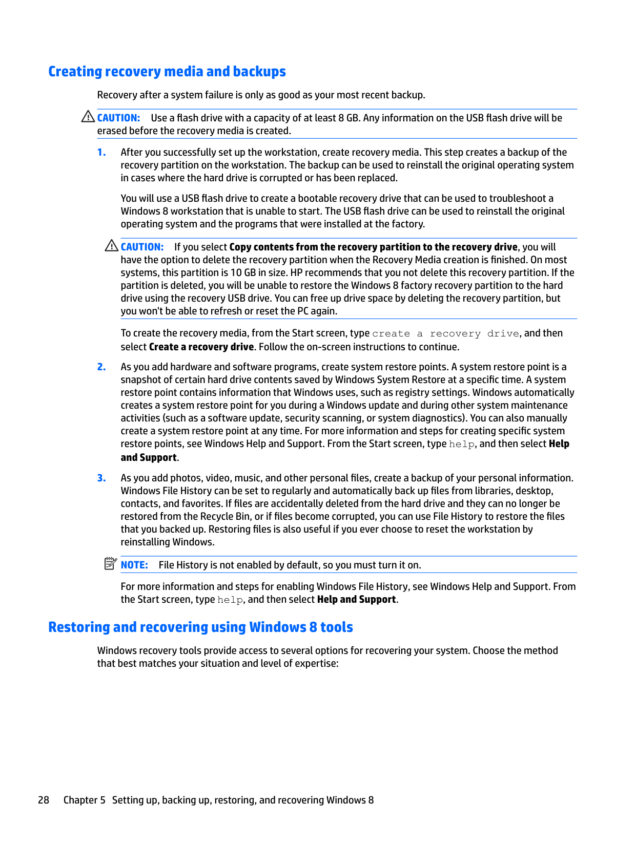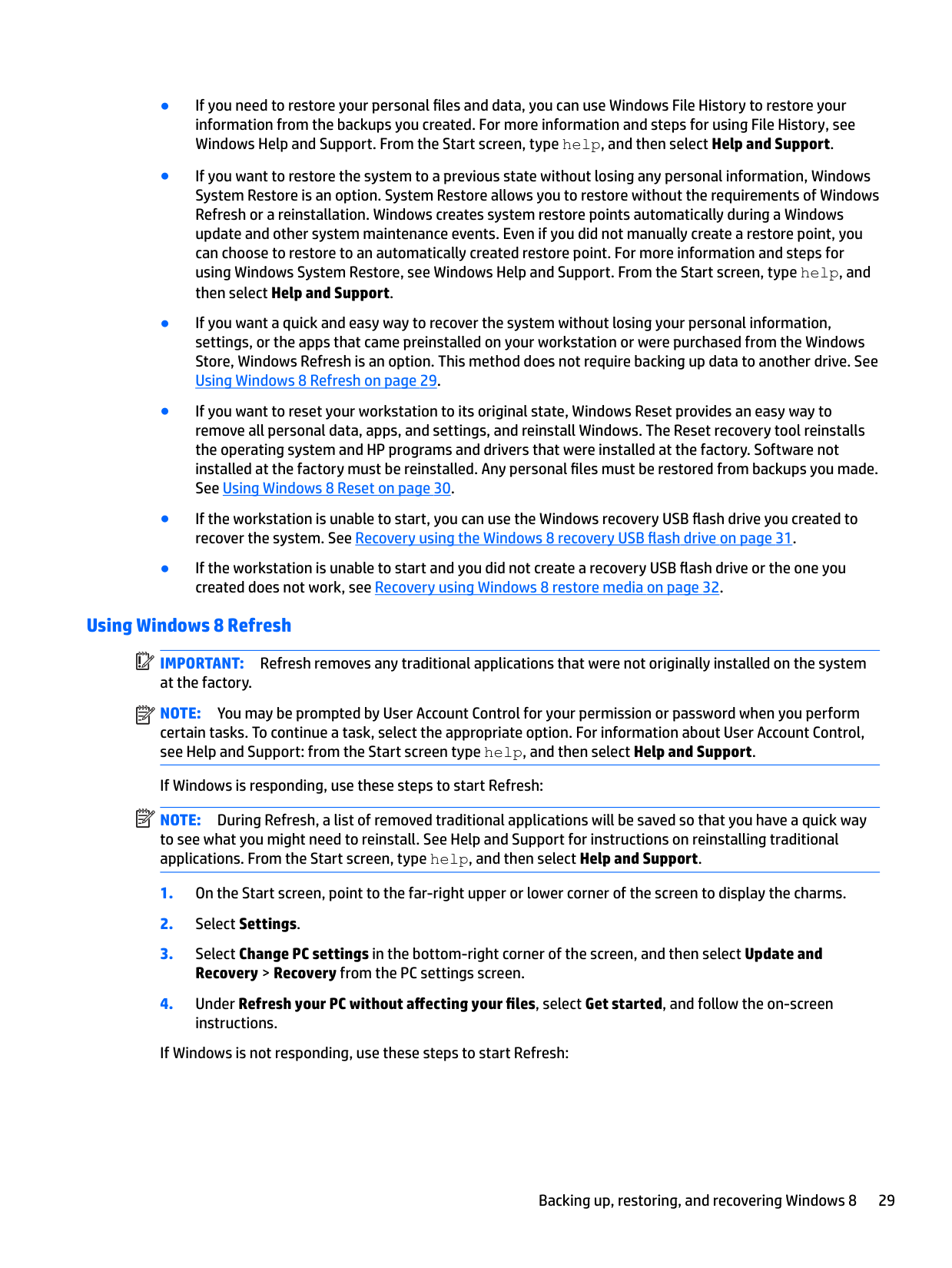File History is not enabled by default, so you must turn it on. For more information and steps for enabling Windows File History, see Windows Help and Support. From the Start screen, type help, and then select Help and Support. Restoring and recovering using Windows 8 tools Windows recovery tools provide access to several options for recovering your system. Choose the method that best matches your situation and level of expertise: 28 Chapter 5 Setting up, backing up, restoring, and recovering Windows 8● If you need to restore your personal files and data, you can use Windows File History to restore your information from the backups you created. For more information and steps for using File History, see Windows Help and Support. From the Start screen, type help, and then select Help and Support. ● If you want to restore the system to a previous state without losing any personal information, Windows System Restore is an option. System Restore allows you to restore without the requirements of Windows Refresh or a reinstallation. Windows creates system restore points automatically during a Windows update and other system maintenance events. Even if you did not manually create a restore point, you can choose to restore to an automatically created restore point. For more information and steps for using Windows System Restore, see Windows Help and Support. From the Start screen, type help, and then select Help and Support. ● If you want a quick and easy way to recover the system without losing your personal information, settings, or the apps that came preinstalled on your workstation or were purchased from the Windows Store, Windows Refresh is an option. This method does not require backing up data to another drive. See Using Windows 8 Refresh on page 29. ● If you want to reset your workstation to its original state, Windows Reset provides an easy way to remove all personal data, apps, and settings, and reinstall Windows. The Reset recovery tool reinstalls the operating system and HP programs and drivers that were installed at the factory. Software not installed at the factory must be reinstalled. Any personal files must be restored from backups you made. See Using Windows 8 Reset on page 30. ● If the workstation is unable to start, you can use the Windows recovery USB flash drive you created to recover the system. See Recovery using the Windows 8 recovery USB flash drive on page 31. ● If the workstation is unable to start and you did not create a recovery USB flash drive or the one you created does not work, see Recovery using Windows 8 restore media on page 32. Using Windows 8 Refresh