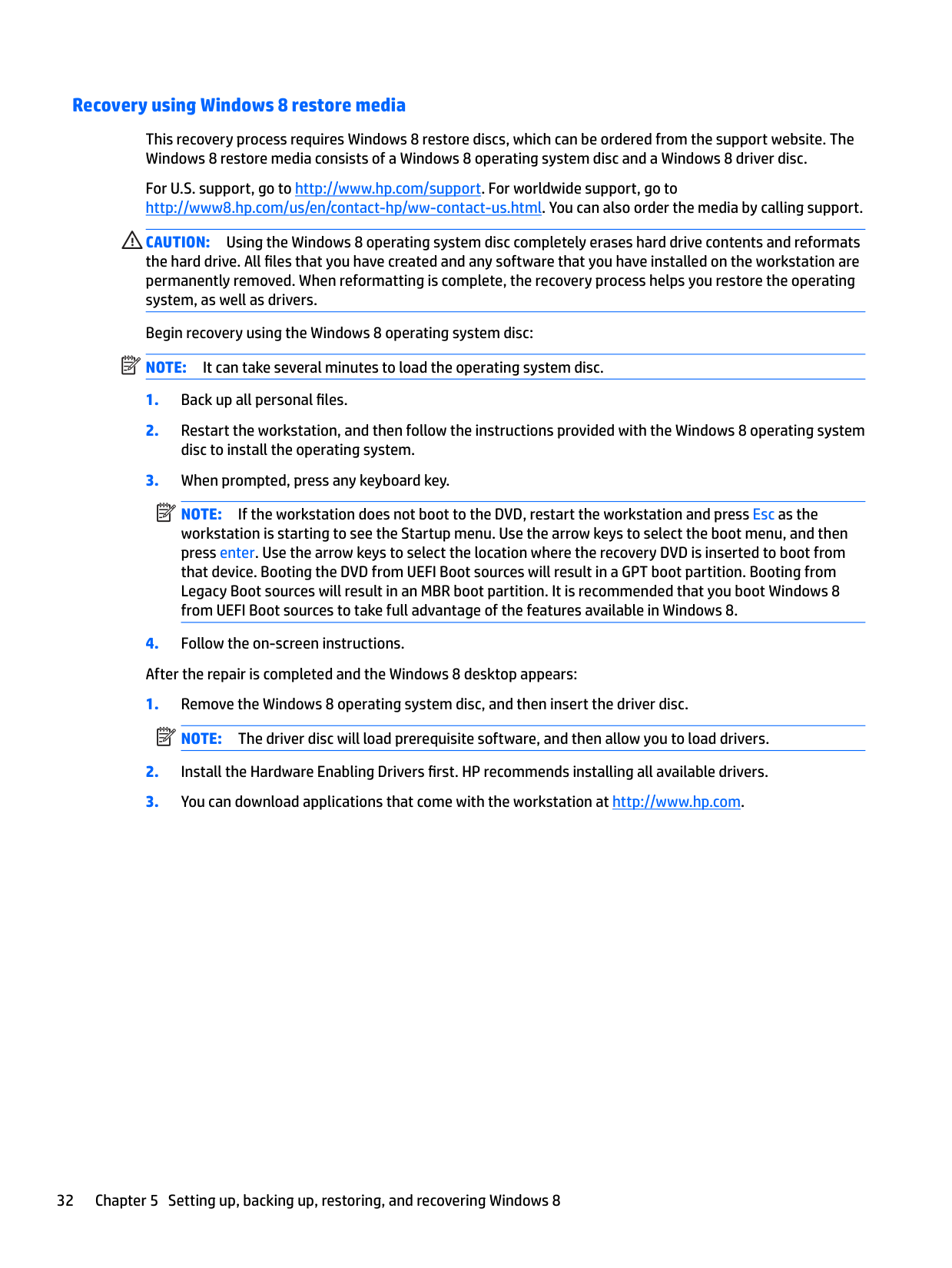 If you did not create a recovery USB flash drive or the one you created does not work, see Recovery using Windows 8 restore media on page 32.Recovery using Windows 8 restore media This recovery process requires Windows 8 restore discs, which can be ordered from the support website. The Windows 8 restore media consists of a Windows 8 operating system disc and a Windows 8 driver disc. For U.S. support, go to http://www.hp.com/support. For worldwide support, go to http://www8.hp.com/us/en/contact-hp/ww-contact-us.html. You can also order the media by calling support.