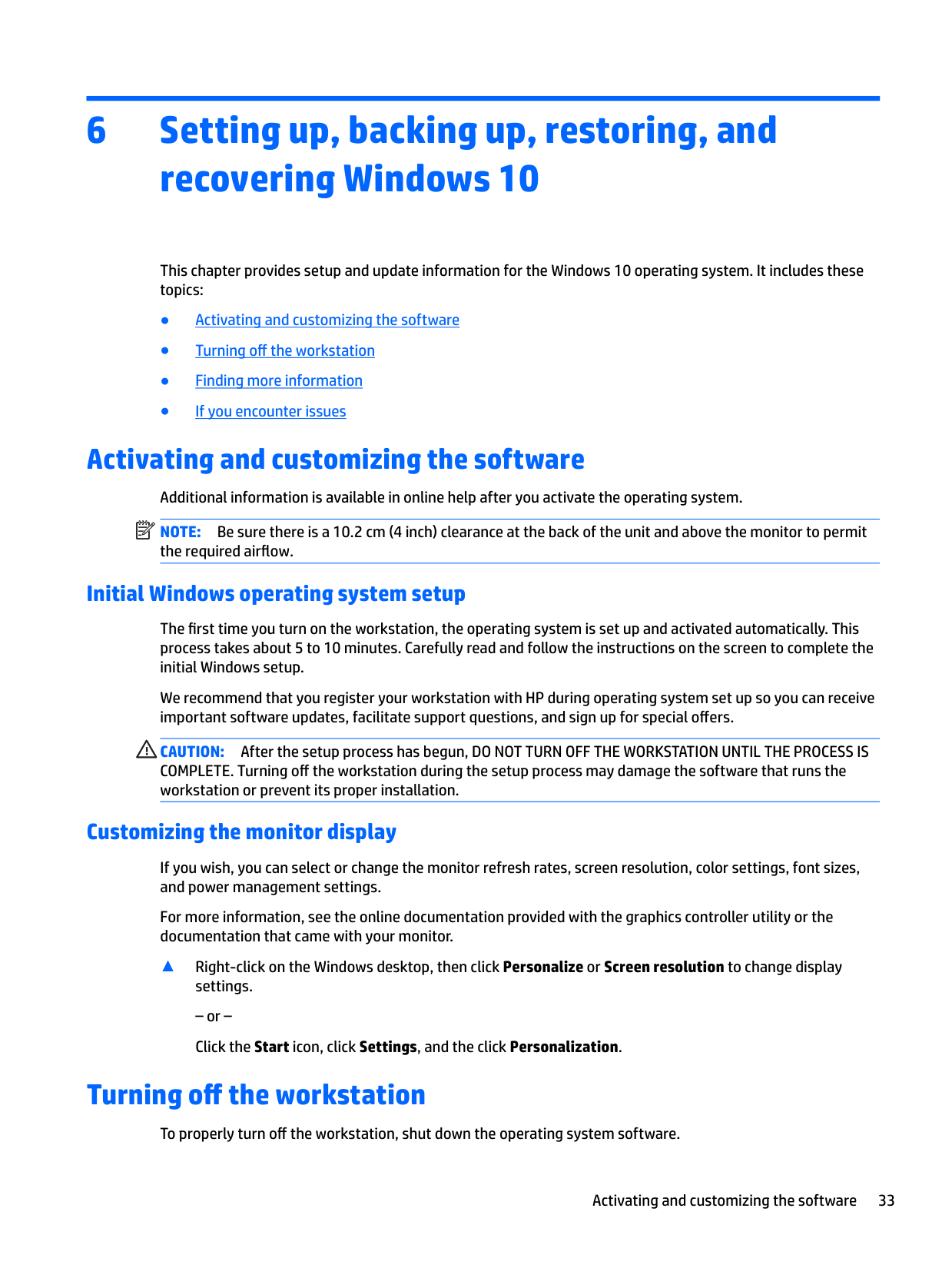 The driver disc will load prerequisite software, and then allow you to load drivers.6 Setting up, backing up, restoring, and recovering Windows 10 This chapter provides setup and update information for the Windows 10 operating system. It includes these topics: ● Activating and customizing the software ● Turning off the workstation ● Finding more information ● If you encounter issues Activating and customizing the software Additional information is available in online help after you activate the operating system.