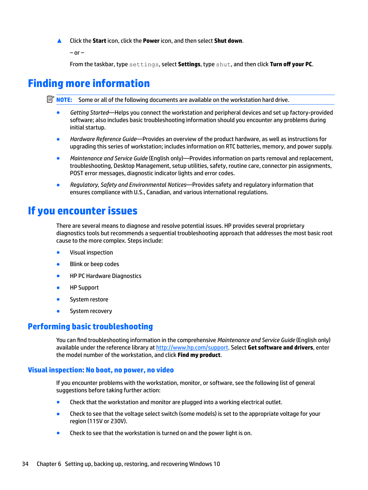 Some or all of the following documents are available on the workstation hard drive. ● Getting Started—Helps you connect the workstation and peripheral devices and set up factory-provided software; also includes basic troubleshooting information should you encounter any problems during initial startup. ● Hardware Reference Guide—Provides an overview of the product hardware, as well as instructions for upgrading this series of workstation; includes information on RTC batteries, memory, and power supply. ● Maintenance and Service Guide (English only)—Provides information on parts removal and replacement, troubleshooting, Desktop Management, setup utilities, safety, routine care, connector pin assignments, POST error messages, diagnostic indicator lights and error codes. ● Regulatory, Safety and Environmental Notices—Provides safety and regulatory information that ensures compliance with U.S., Canadian, and various international regulations. If you encounter issues There are several means to diagnose and resolve potential issues. HP provides several proprietary diagnostics tools but recommends a sequential troubleshooting approach that addresses the most basic root cause to the more complex. Steps include: ● Visual inspection ● Blink or beep codes ● HP PC Hardware Diagnostics ● HP Support ● System restore ● System recovery Performing basic troubleshooting You can find troubleshooting information in the comprehensive Maintenance and Service Guide (English only) available under the reference library at http://www.hp.com/support. Select Get software and drivers, enter the model number of the workstation, and click Find my product. Visual inspection: No boot, no power, no video If you encounter problems with the workstation, monitor, or software, see the following list of general suggestions before taking further action: ● Check that the workstation and monitor are plugged into a working electrical outlet. ● Check to see that the voltage select switch (some models) is set to the appropriate voltage for your region (115V or 230V). ● Check to see that the workstation is turned on and the power light is on. 34 Chapter 6 Setting up, backing up, restoring, and recovering Windows 10● Check to see that the monitor is turned on and the monitor light is on. ● Turn up the brightness and contrast controls of the monitor if the monitor is dim. ● If the system does not boot, press and hold any key. If the system beeps, then the keyboard is operating correctly. ● Check all cable connections for loose connections or incorrect connections. ● Wake the workstation by pressing any key on the keyboard or pressing the power button. If the system remains in sleep mode, shut down the workstation by pressing and holding the power button for at least four seconds. Then press the power button again to restart the workstation. If the system will not shut down, unplug the power cord, wait a few seconds, and then plug it in again. The workstation will restart if automatic start on power loss is set in Computer Setup. If the workstation does not restart, press the power button. ● Reconfigure your workstation after installing a non-Plug and Play expansion board or other option. ● Be sure that all the needed device drivers have been installed. For example, if you are using a printer, you need a driver for that printer model. ● Remove any bootable media (CD/DVD or USB device) from the system before turning it on. ● If you have installed an operating system other than the factory-installed operating system, check to be sure that it is supported on the system. ● If the system has multiple video sources (embedded, PCI, or PCI-Express adapters) installed (embedded video on some models only) and a single monitor, the monitor must be connected to the monitor port on the source that is set as the primary video source. During boot, the other video ports are disabled and if the monitor is connected to one of these ports, the monitor will not function. You can select or change the primary video source in Computer Setup.