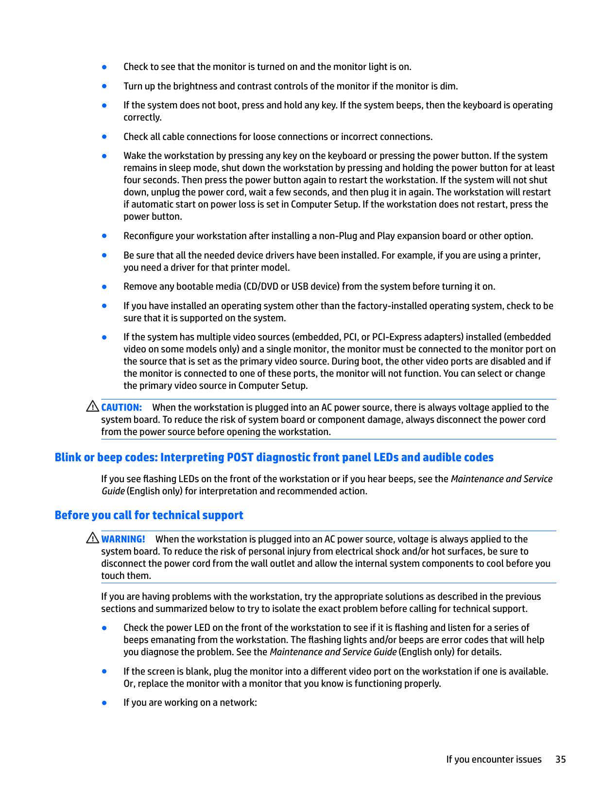 When the workstation is plugged into an AC power source, there is always voltage applied to the system board. To reduce the risk of system board or component damage, always disconnect the power cord from the power source before opening the workstation. Blink or beep codes: Interpreting POST diagnostic front panel LEDs and audible codes If you see flashing LEDs on the front of the workstation or if you hear beeps, see the Maintenance and Service Guide (English only) for interpretation and recommended action. Before you call for technical supportWarning!