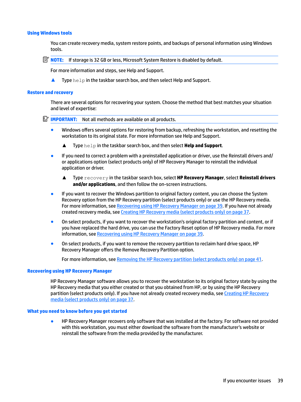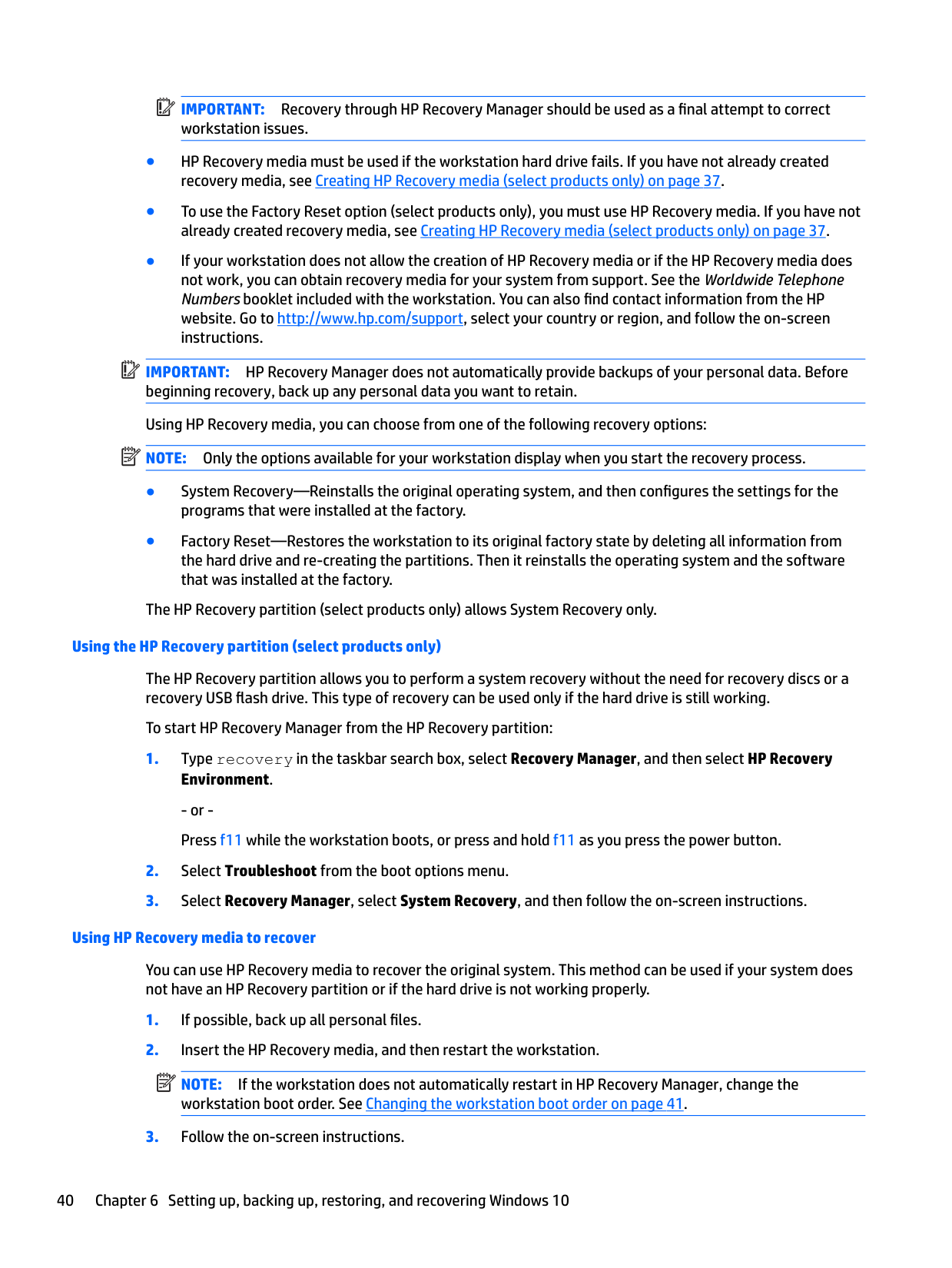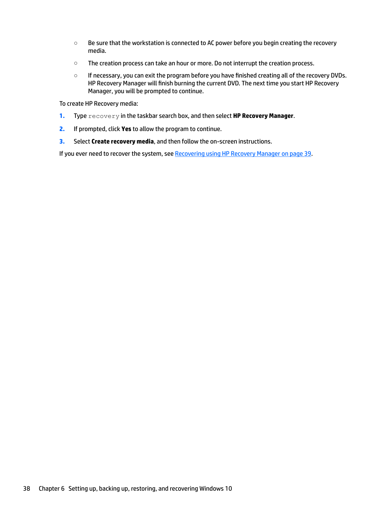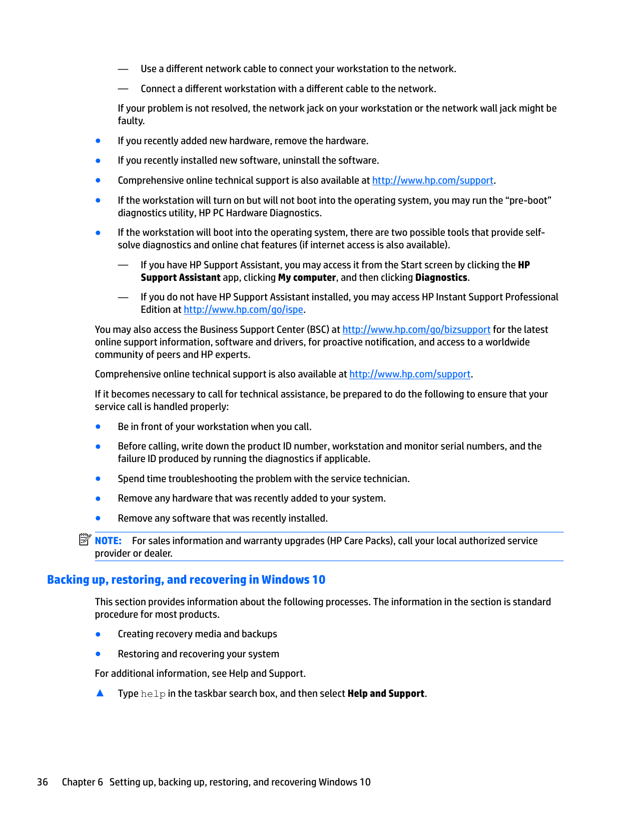 For sales information and warranty upgrades (HP Care Packs), call your local authorized service provider or dealer. Backing up, restoring, and recovering in Windows 10 This section provides information about the following processes. The information in the section is standard procedure for most products. ● Creating recovery media and backups ● Restoring and recovering your system For additional information, see Help and Support. ▲ Type help in the taskbar search box, and then select Help and Support. 36 Chapter 6 Setting up, backing up, restoring, and recovering Windows 10Creating recovery media and backups The following methods of creating recovery media and backups are available on select products only. Choose the available method according to your workstation model. ● Use HP Recovery Manager to create HP Recovery media after you successfully set up the workstation. This step creates a backup of the HP Recovery partition on the workstation. The backup can be used to reinstall the original operating system in cases where the hard drive is corrupted or has been replaced. For information on creating recovery media, see Creating HP Recovery media (select products only) on page 37. For information on the recovery options that are available using the recovery media, see Using Windows tools on page 39. ● Use Windows tools to create system restore points and create backups of personal information. For more information, see Recovering using HP Recovery Manager on page 39.
