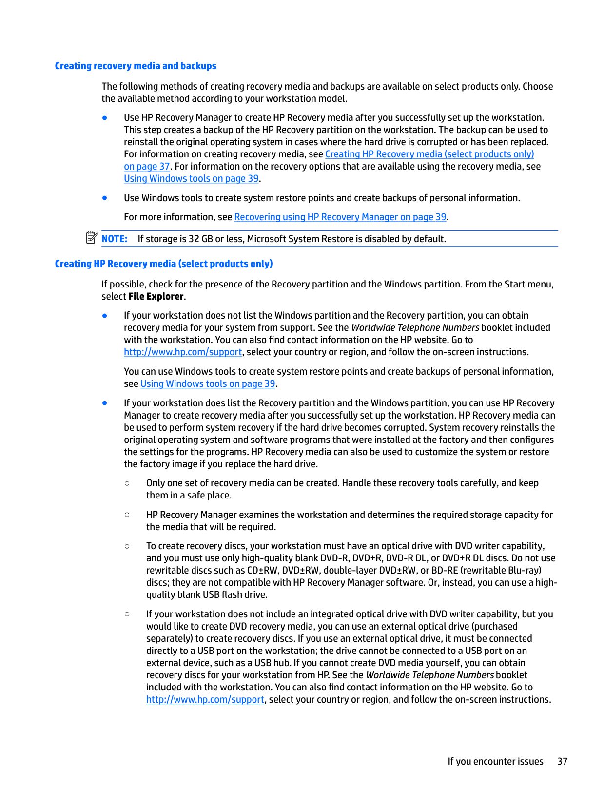If storage is 32 GB or less, Microsoft System Restore is disabled by default. Creating HP Recovery media (select products only) If possible, check for the presence of the Recovery partition and the Windows partition. From the Start menu, select File Explorer. ● If your workstation does not list the Windows partition and the Recovery partition, you can obtain recovery media for your system from support. See the Worldwide Telephone Numbers booklet included with the workstation. You can also find contact information on the HP website. Go to http://www.hp.com/support, select your country or region, and follow the on-screen instructions. You can use Windows tools to create system restore points and create backups of personal information, see Using Windows tools on page 39. ● If your workstation does list the Recovery partition and the Windows partition, you can use HP Recovery Manager to create recovery media after you successfully set up the workstation. HP Recovery media can be used to perform system recovery if the hard drive becomes corrupted. System recovery reinstalls the original operating system and software programs that were installed at the factory and then configuresthe settings for the programs. HP Recovery media can also be used to customize the system or restore the factory image if you replace the hard drive. ○ Only one set of recovery media can be created. Handle these recovery tools carefully, and keep them in a safe place. ○ HP Recovery Manager examines the workstation and determines the required storage capacity for the media that will be required. ○ To create recovery discs, your workstation must have an optical drive with DVD writer capability, and you must use only high-quality blank DVD-R, DVD+R, DVD-R DL, or DVD+R DL discs. Do not use rewritable discs such as CD±RW, DVD±RW, double-layer DVD±RW, or BD-RE (rewritable Blu-ray) discs; they are not compatible with HP Recovery Manager software. Or, instead, you can use a high- quality blank USB flash drive. ○ If your workstation does not include an integrated optical drive with DVD writer capability, but you would like to create DVD recovery media, you can use an external optical drive (purchased separately) to create recovery discs. If you use an external optical drive, it must be connected directly to a USB port on the workstation; the drive cannot be connected to a USB port on an external device, such as a USB hub. If you cannot create DVD media yourself, you can obtain recovery discs for your workstation from HP. See the Worldwide Telephone Numbers booklet included with the workstation. You can also find contact information on the HP website. Go to http://www.hp.com/support, select your country or region, and follow the on-screen instructions. If you encounter issues 37