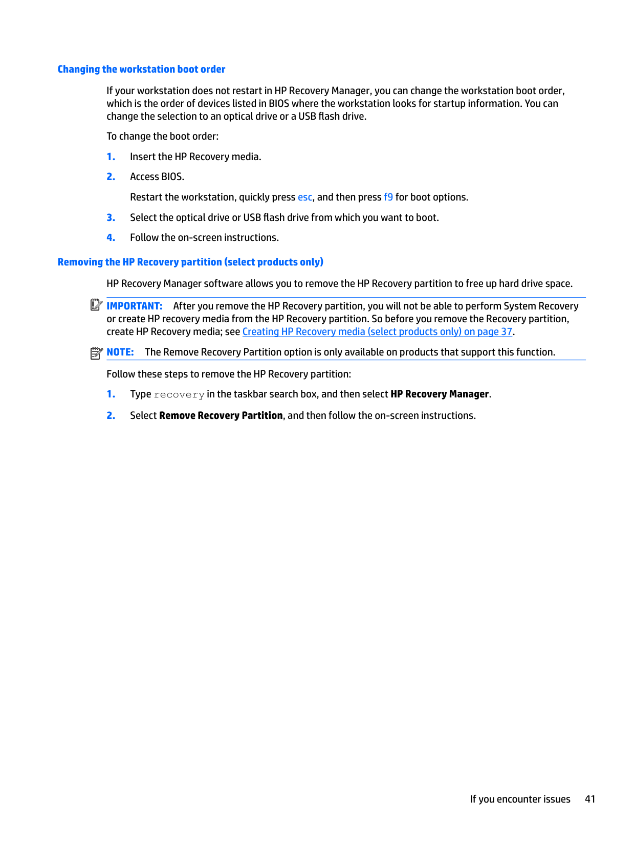 Not all methods are available on all products. ● Windows offers several options for restoring from backup, refreshing the workstation, and resetting the workstation to its original state. For more information see Help and Support. ▲ Type help in the taskbar search box, and then select Help and Support. ● If you need to correct a problem with a preinstalled application or driver, use the Reinstall drivers and/ or applications option (select products only) of HP Recovery Manager to reinstall the individual application or driver. ▲ Type recovery in the taskbar search box, select HP Recovery Manager, select Reinstall drivers and/or applications, and then follow the on-screen instructions. ● If you want to recover the Windows partition to original factory content, you can choose the System Recovery option from the HP Recovery partition (select products only) or use the HP Recovery media. For more information, see Recovering using HP Recovery Manager on page 39. If you have not already created recovery media, see Creating HP Recovery media (select products only) on page 37. ● On select products, if you want to recover the workstation’s original factory partition and content, or if you have replaced the hard drive, you can use the Factory Reset option of HP Recovery media. For more information, see Recovering using HP Recovery Manager on page 39. ● On select products, if you want to remove the recovery partition to reclaim hard drive space, HP Recovery Manager offers the Remove Recovery Partition option. For more information, see Removing the HP Recovery partition (select products only) on page 41. Recovering using HP Recovery Manager HP Recovery Manager software allows you to recover the workstation to its original factory state by using the HP Recovery media that you either created or that you obtained from HP, or by using the HP Recovery partition (select products only). If you have not already created recovery media, see Creating HP Recovery media (select products only) on page 37. What you need to know before you get started ● HP Recovery Manager recovers only software that was installed at the factory. For software not provided with this workstation, you must either download the software from the manufacturer's website or reinstall the software from the media provided by the manufacturer. If you encounter issues 39Important: