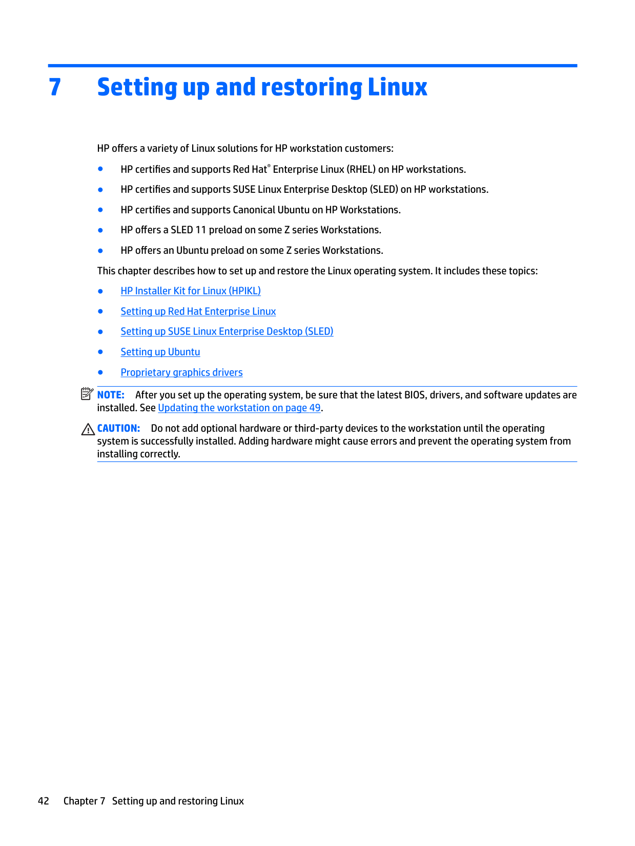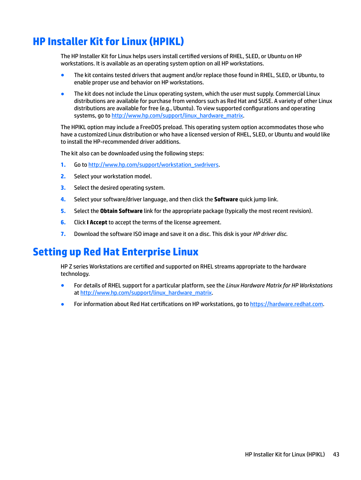 The Remove Recovery Partition option is only available on products that support this function. Follow these steps to remove the HP Recovery partition:7 Setting up and restoring Linux HP offers a variety of Linux solutions for HP workstation customers: ● HP certifies and supports Red Hat® Enterprise Linux (RHEL) on HP workstations. ● HP certifies and supports SUSE Linux Enterprise Desktop (SLED) on HP workstations. ● HP certifies and supports Canonical Ubuntu on HP Workstations. ● HP offers a SLED 11 preload on some Z series Workstations. ● HP offers an Ubuntu preload on some Z series Workstations. This chapter describes how to set up and restore the Linux operating system. It includes these topics: ● HP Installer Kit for Linux (HPIKL) ● Setting up Red Hat Enterprise Linux ● Setting up SUSE Linux Enterprise Desktop (SLED) ● Setting up Ubuntu ● Proprietary graphics drivers