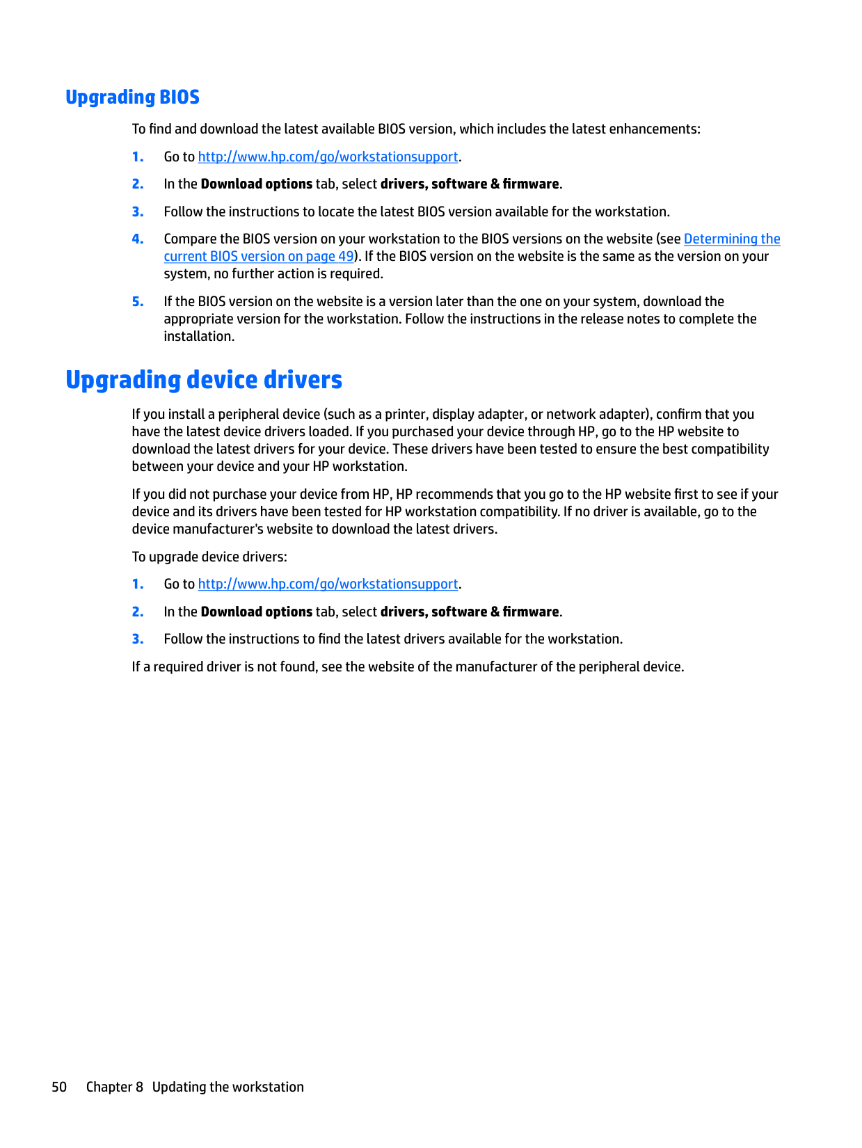 For procedures for upgrading the BIOS as well as the F10 Setup utility BIOS Menu settings, see the Maintenance and Service Guide at http://www.hp.com/support/workstation_manuals. Updating the workstation after first boot 49Upgrading BIOS To find and download the latest available BIOS version, which includes the latest enhancements: