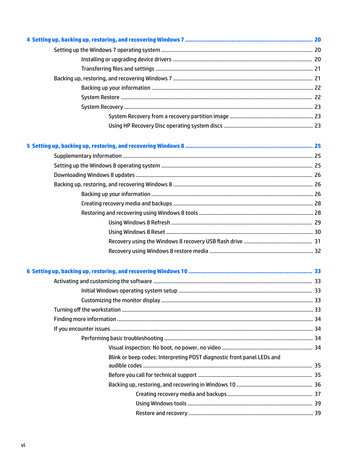 4 Setting up, backing up, restoring, and recovering Windows 7 .......................................................................... 20 Setting up the Windows 7 operating system ...................................................................................................... 20 Installing or upgrading device drivers .............................................................................................. 20 Transferring files and settings .......................................................................................................... 21 Backing up, restoring, and recovering Windows 7 .............................................................................................. 21 Backing up your information ............................................................................................................. 22 System Restore ................................................................................................................................. 22 System Recovery ............................................................................................................................... 23 System Recovery from a recovery partition image ........................................................ 23 Using HP Recovery Disc operating system discs ............................................................ 23 5 Setting up, backing up, restoring, and recovering Windows 8 .......................................................................... 25 Supplementary information ................................................................................................................................ 25 Setting up the Windows 8 operating system ...................................................................................................... 25 Downloading Windows 8 updates ....................................................................................................................... 26 Backing up, restoring, and recovering Windows 8 .............................................................................................. 26 Backing up your information ............................................................................................................. 26 Creating recovery media and backups .............................................................................................. 28 Restoring and recovering using Windows 8 tools ............................................................................. 28 Using Windows 8 Refresh ............................................................................................... 29 Using Windows 8 Reset ................................................................................................... 30 Recovery using the Windows 8 recovery USB flash drive .............................................. 31 Recovery using Windows 8 restore media ...................................................................... 32 6 Setting up, backing up, restoring, and recovering Windows 10 ........................................................................ 33 Activating and customizing the software ........................................................................................................... 33 Initial Windows operating system setup .......................................................................................... 33 Customizing the monitor display ...................................................................................................... 33 Turning off the workstation ................................................................................................................................. 33 Finding more information .................................................................................................................................... 34 If you encounter issues ........................................................................................................................................ 34 Performing basic troubleshooting .................................................................................................... 34 Visual inspection: No boot, no power, no video ............................................................. 34 Blink or beep codes: Interpreting POST diagnostic front panel LEDs and audible codes .................................................................................................................. 35 Before you call for technical support ............................................................................. 35 Backing up, restoring, and recovering in Windows 10 ................................................... 36 Creating recovery media and backups ......................................................... 37 Using Windows tools .................................................................................... 39 Restore and recovery .................................................................................... 39 vi
