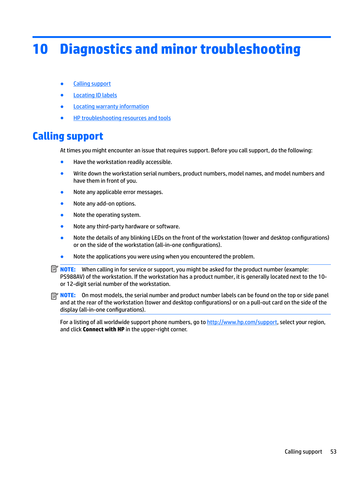 The HP PC Hardware Diagnostics (UEFI) download instructions are provided in English only, and you must use a Windows computer to download and create the HP UEFI support environment because only .exe files are offered. There are two options to download HP PC Hardware Diagnostics to a USB device. Download the latest UEFI version10 Diagnostics and minor troubleshooting ● Calling support ● Locating ID labels ● Locating warranty information ● HP troubleshooting resources and tools Calling support At times you might encounter an issue that requires support. Before you call support, do the following: ● Have the workstation readily accessible. ● Write down the workstation serial numbers, product numbers, model names, and model numbers and have them in front of you. ● Note any applicable error messages. ● Note any add-on options. ● Note the operating system. ● Note any third-party hardware or software. ● Note the details of any blinking LEDs on the front of the workstation (tower and desktop configurations)