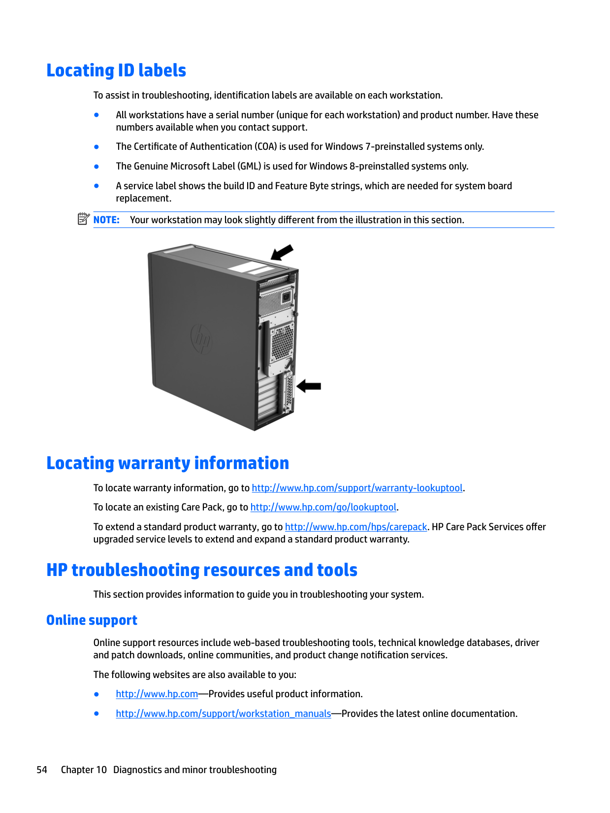 Your workstation may look slightly different from the illustration in this section. Locating warranty information To locate warranty information, go to http://www.hp.com/support/warranty-lookuptool. To locate an existing Care Pack, go to http://www.hp.com/go/lookuptool. To extend a standard product warranty, go to http://www.hp.com/hps/carepack. HP Care Pack Services offerupgraded service levels to extend and expand a standard product warranty. HP troubleshooting resources and tools This section provides information to guide you in troubleshooting your system. Online support Online support resources include web-based troubleshooting tools, technical knowledge databases, driver and patch downloads, online communities, and product change notification services. The following websites are also available to you: ● http://www.hp.com—Provides useful product information. ● http://www.hp.com/support/workstation_manuals—Provides the latest online documentation. 54 Chapter 10 Diagnostics and minor troubleshooting