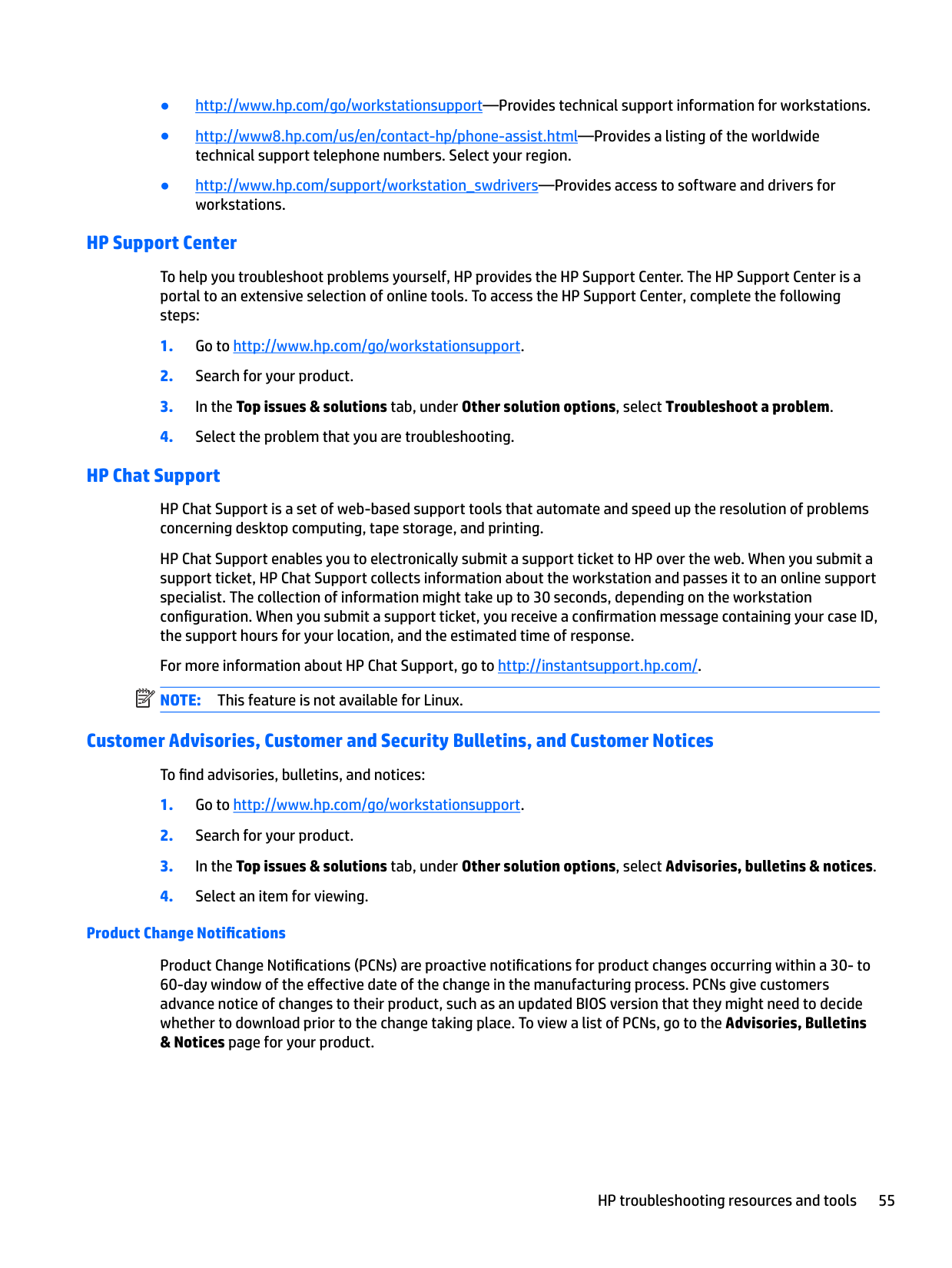 ● http://www.hp.com/go/workstationsupport—Provides technical support information for workstations. ● http://www8.hp.com/us/en/contact-hp/phone-assist.html—Provides a listing of the worldwide technical support telephone numbers. Select your region. ● http://www.hp.com/support/workstation_swdrivers—Provides access to software and drivers for workstations. HP Support Center To help you troubleshoot problems yourself, HP provides the HP Support Center. The HP Support Center is a portal to an extensive selection of online tools. To access the HP Support Center, complete the following steps:
