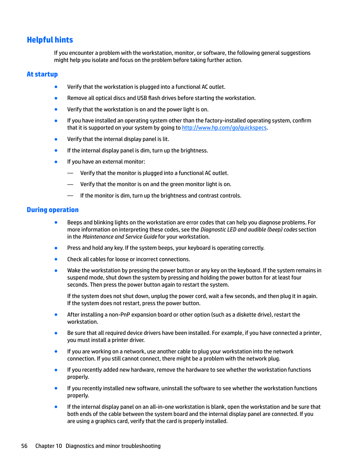 that it is supported on your system by going to http://www.hp.com/go/quickspecs. ● Verify that the internal display panel is lit. ● If the internal display panel is dim, turn up the brightness. ● If you have an external monitor: — Verify that the monitor is plugged into a functional AC outlet. — Verify that the monitor is on and the green monitor light is on. — If the monitor is dim, turn up the brightness and contrast controls. During operation ● Beeps and blinking lights on the workstation are error codes that can help you diagnose problems. For more information on interpreting these codes, see the Diagnostic LED and audible (beep) codes section in the Maintenance and Service Guide for your workstation. ● Press and hold any key. If the system beeps, your keyboard is operating correctly. ● Check all cables for loose or incorrect connections. ● Wake the workstation by pressing the power button or any key on the keyboard. If the system remains in suspend mode, shut down the system by pressing and holding the power button for at least four seconds. Then press the power button again to restart the system. If the system does not shut down, unplug the power cord, wait a few seconds, and then plug it in again. If the system does not restart, press the power button. ● After installing a non-PnP expansion board or other option (such as a diskette drive), restart the workstation. ● Be sure that all required device drivers have been installed. For example, if you have connected a printer, you must install a printer driver. ● If you are working on a network, use another cable to plug your workstation into the network connection. If you still cannot connect, there might be a problem with the network plug. ● If you recently added new hardware, remove the hardware to see whether the workstation functions properly. ● If you recently installed new software, uninstall the software to see whether the workstation functions properly. ● If the internal display panel on an all-in-one workstation is blank, open the workstation and be sure that both ends of the cable between the system board and the internal display panel are connected. If you are using a graphics card, verify that the card is properly installed. 56 Chapter 10 Diagnostics and minor troubleshooting