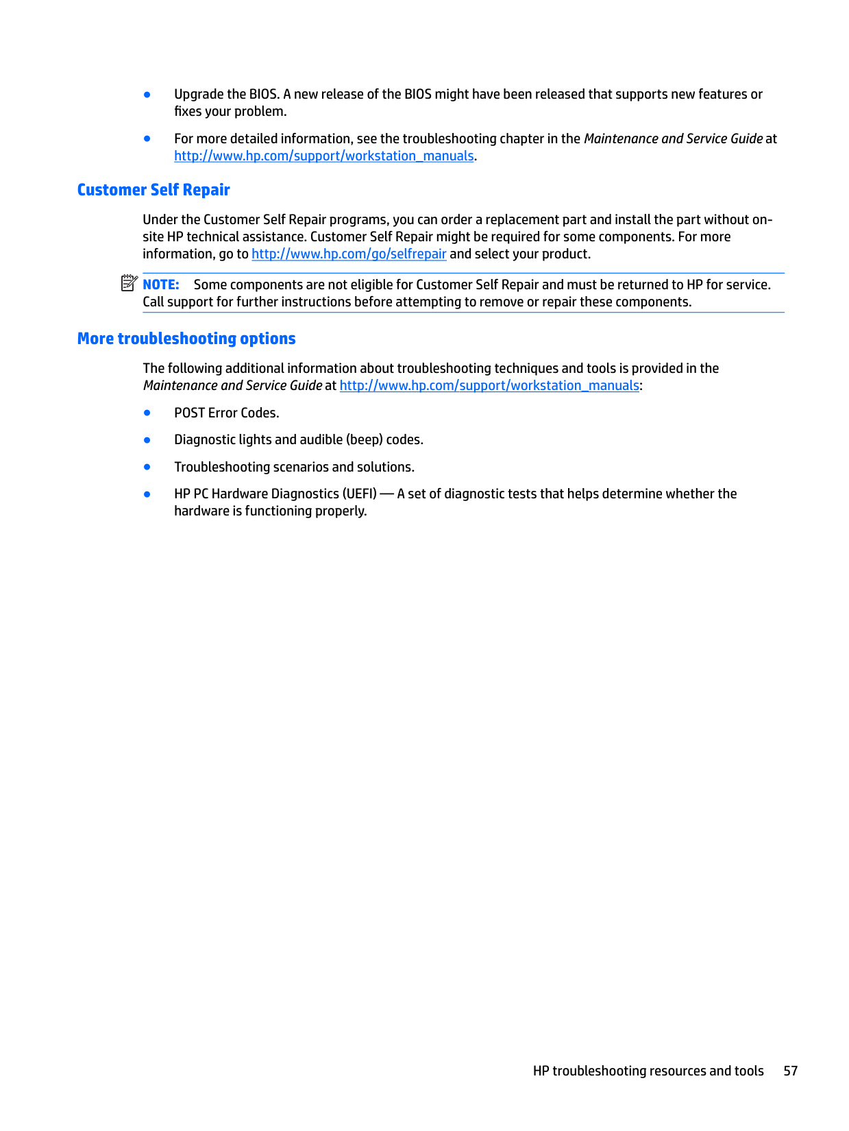 ● Upgrade the BIOS. A new release of the BIOS might have been released that supports new features or fixes your problem. ● For more detailed information, see the troubleshooting chapter in the Maintenance and Service Guide at http://www.hp.com/support/workstation_manuals. Customer Self Repair Under the Customer Self Repair programs, you can order a replacement part and install the part without on- site HP technical assistance. Customer Self Repair might be required for some components. For more information, go to http://www.hp.com/go/selfrepair and select your product.