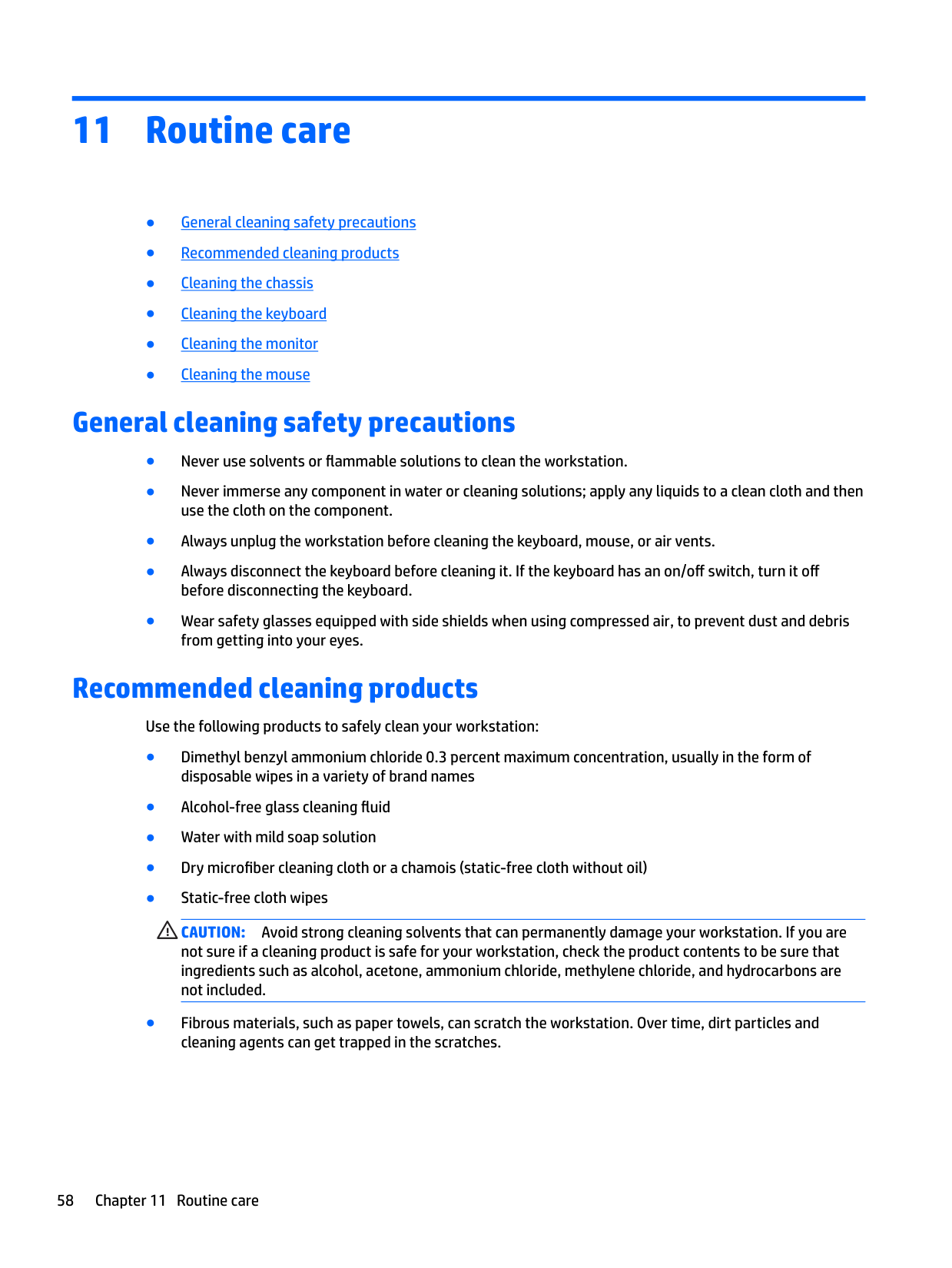 Some components are not eligible for Customer Self Repair and must be returned to HP for service. Call support for further instructions before attempting to remove or repair these components. More troubleshooting options The following additional information about troubleshooting techniques and tools is provided in the Maintenance and Service Guide at http://www.hp.com/support/workstation_manuals: ● POST Error Codes. ● Diagnostic lights and audible (beep) codes. ● Troubleshooting scenarios and solutions. ● HP PC Hardware Diagnostics (UEFI) — A set of diagnostic tests that helps determine whether the hardware is functioning properly. HP troubleshooting resources and tools 5711 Routine care ● General cleaning safety precautions ● Recommended cleaning products ● Cleaning the chassis ● Cleaning the keyboard ● Cleaning the monitor ● Cleaning the mouse General cleaning safety precautions ● Never use solvents or flammable solutions to clean the workstation. ● Never immerse any component in water or cleaning solutions; apply any liquids to a clean cloth and then use the cloth on the component. ● Always unplug the workstation before cleaning the keyboard, mouse, or air vents. ● Always disconnect the keyboard before cleaning it. If the keyboard has an on/off switch, turn it off