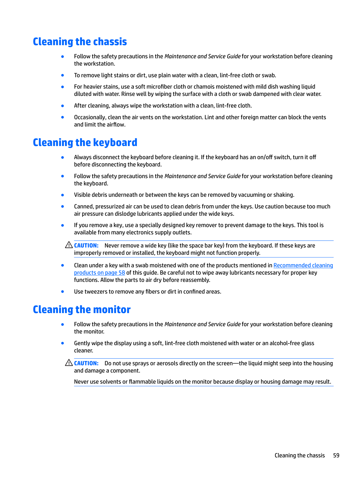 Never remove a wide key (like the space bar key) from the keyboard. If these keys are improperly removed or installed, the keyboard might not function properly. ● Clean under a key with a swab moistened with one of the products mentioned in Recommended cleaning products on page 58 of this guide. Be careful not to wipe away lubricants necessary for proper key functions. Allow the parts to air dry before reassembly. ● Use tweezers to remove any fibers or dirt in confined areas. Cleaning the monitor ● Follow the safety precautions in the Maintenance and Service Guide for your workstation before cleaning the monitor. ● Gently wipe the display using a soft, lint-free cloth moistened with water or an alcohol-free glass cleaner.Caution: