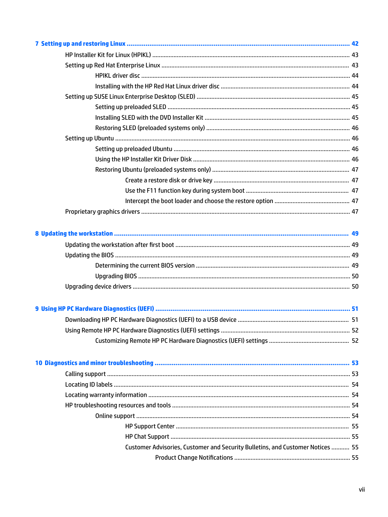 7 Setting up and restoring Linux ...................................................................................................................... 42 HP Installer Kit for Linux (HPIKL) ......................................................................................................................... 43 Setting up Red Hat Enterprise Linux ................................................................................................................... 43 HPIKL driver disc ................................................................................................................................ 44 Installing with the HP Red Hat Linux driver disc ............................................................................... 44 Setting up SUSE Linux Enterprise Desktop (SLED) .............................................................................................. 45 Setting up preloaded SLED ................................................................................................................ 45 Installing SLED with the DVD Installer Kit ......................................................................................... 45 Restoring SLED (preloaded systems only) ........................................................................................ 46 Setting up Ubuntu ................................................................................................................................................ 46 Setting up preloaded Ubuntu ............................................................................................................ 46 Using the HP Installer Kit Driver Disk ................................................................................................ 46 Restoring Ubuntu (preloaded systems only) .................................................................................... 47 Create a restore disk or drive key ................................................................................... 47 Use the F11 function key during system boot ............................................................... 47 Intercept the boot loader and choose the restore option .............................................. 47 Proprietary graphics drivers ................................................................................................................................ 47 8 Updating the workstation ............................................................................................................................ 49 Updating the workstation after first boot ........................................................................................................... 49 Updating the BIOS ................................................................................................................................................ 49 Determining the current BIOS version .............................................................................................. 49 Upgrading BIOS .................................................................................................................................. 50 Upgrading device drivers ..................................................................................................................................... 50 9 Using HP PC Hardware Diagnostics (UEFI) ....................................................................................................... 51 Downloading HP PC Hardware Diagnostics (UEFI) to a USB device .................................................................... 51 Using Remote HP PC Hardware Diagnostics (UEFI) settings ............................................................................... 52 Customizing Remote HP PC Hardware Diagnostics (UEFI) settings ................................................. 52 10 Diagnostics and minor troubleshooting ....................................................................................................... 53 Calling support ..................................................................................................................................................... 53 Locating ID labels ................................................................................................................................................ 54 Locating warranty information ........................................................................................................................... 54 HP troubleshooting resources and tools ............................................................................................................. 54 Online support ................................................................................................................................... 54 HP Support Center .......................................................................................................... 55 HP Chat Support .............................................................................................................. 55 Customer Advisories, Customer and Security Bulletins, and Customer Notices ........... 55 Product Change Notifications ....................................................................... 55 vii