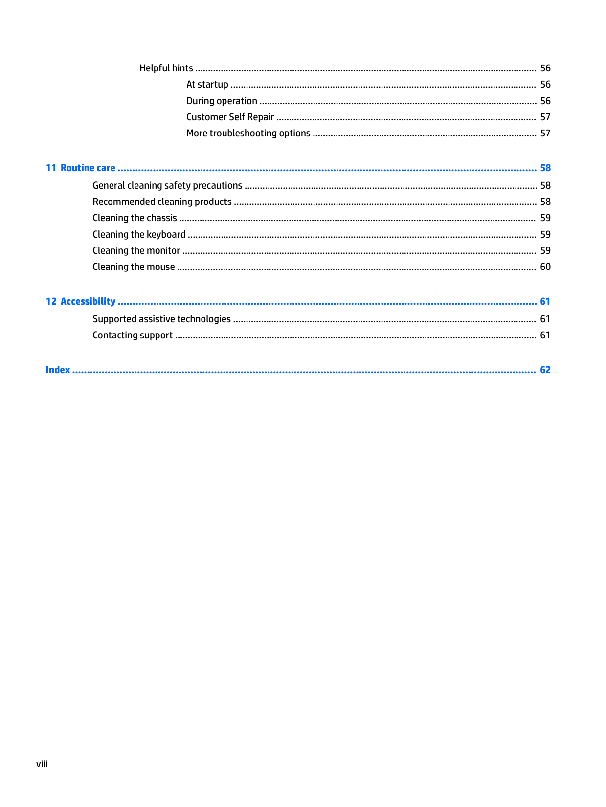 Helpful hints ...................................................................................................................................... 56 At startup ........................................................................................................................ 56 During operation ............................................................................................................. 56 Customer Self Repair ...................................................................................................... 57 More troubleshooting options ........................................................................................ 57 11 Routine care .............................................................................................................................................. 58 General cleaning safety precautions ................................................................................................................... 58 Recommended cleaning products ....................................................................................................................... 58 Cleaning the chassis ............................................................................................................................................ 59 Cleaning the keyboard ......................................................................................................................................... 59 Cleaning the monitor ........................................................................................................................................... 59 Cleaning the mouse ............................................................................................................................................. 60 12 Accessibility .............................................................................................................................................. 61 Supported assistive technologies ....................................................................................................................... 61 Contacting support .............................................................................................................................................. 61 Index ............................................................................................................................................................. 62 viii