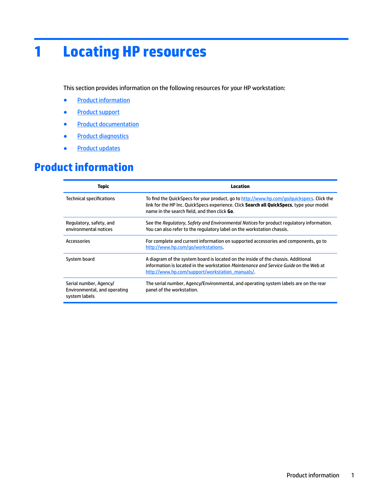 1 Locating HP resources This section provides information on the following resources for your HP workstation: ● Product information ● Product support ● Product documentation ● Product diagnostics ● Product updates Product information Topic Location Technical specifications To find the QuickSpecs for your product, go to http://www.hp.com/go/quickspecs. Click the link for the HP Inc. QuickSpecs experience. Click Search all QuickSpecs, type your model name in the search field, and then click Go. Regulatory, safety, and environmental notices See the Regulatory, Safety and Environmental Notices for product regulatory information. You can also refer to the regulatory label on the workstation chassis. Accessories For complete and current information on supported accessories and components, go to http://www.hp.com/go/workstations. System board A diagram of the system board is located on the inside of the chassis. Additional information is located in the workstation Maintenance and Service Guide on the Web at http://www.hp.com/support/workstation_manuals/. Serial number, Agency/ Environmental, and operating system labels The serial number, Agency/Environmental, and operating system labels are on the rear panel of the workstation. Product information 1