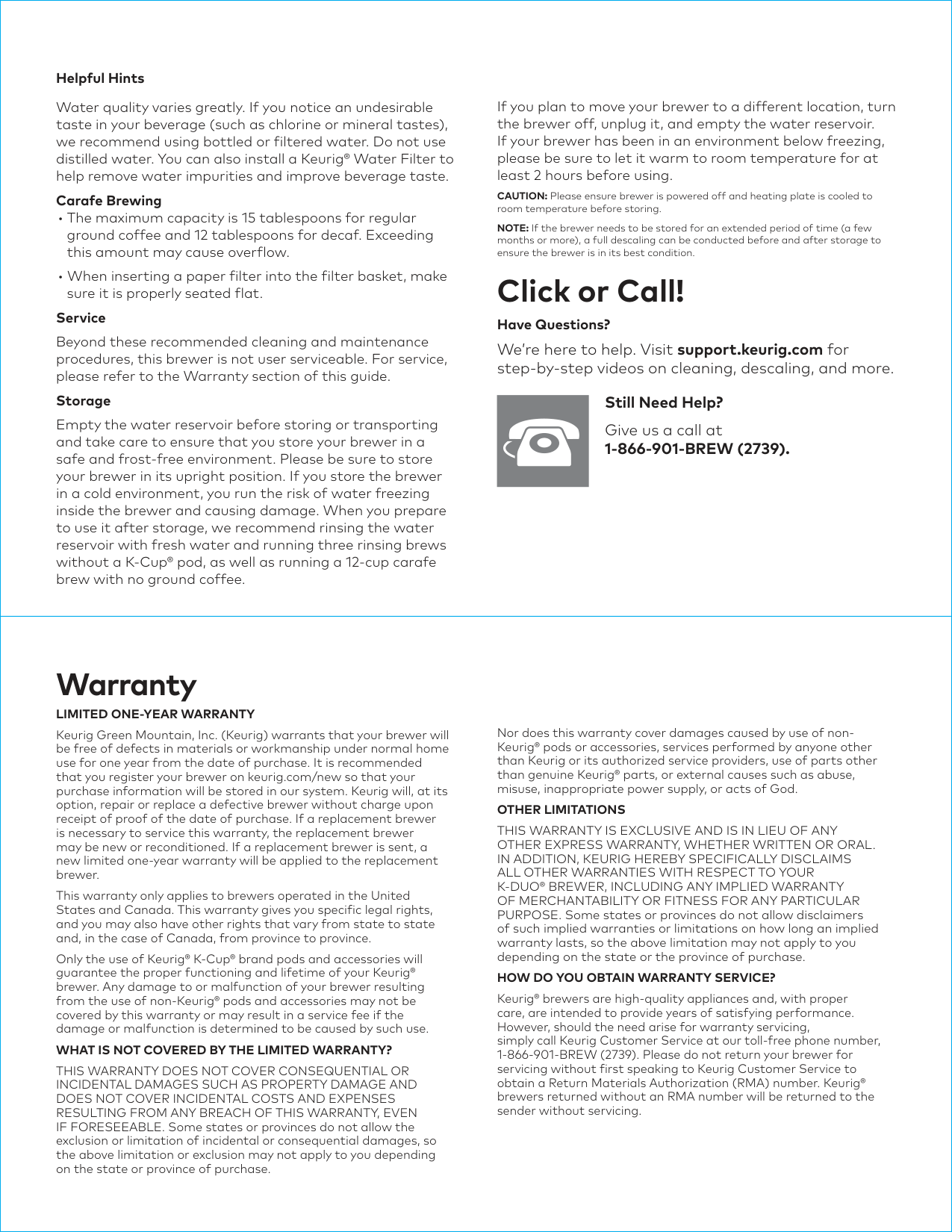 Keurig® brewers are high-quality appliances and, with proper care, are intended to provide years of satisfying performance. However, should the need arise for warranty servicing, simply call Keurig Customer Service at our toll-free phone number, 1-866-901-BREW (2739). Please do not return your brewer for servicing without first speaking to Keurig Customer Service to obtain a Return Materials Authorization (RMA) number. Keurig® brewers returned without an RMA number will be returned to the sender without servicing. Helpful Hints Water quality varies greatly. If you notice an undesirable taste in your beverage (such as chlorine or mineral tastes), we recommend using bottled or filtered water. Do not use distilled water. You can also install a Keurig® Water Filter to help remove water impurities and improve beverage taste. Carafe Brewing1-866-901-Brew (2739).