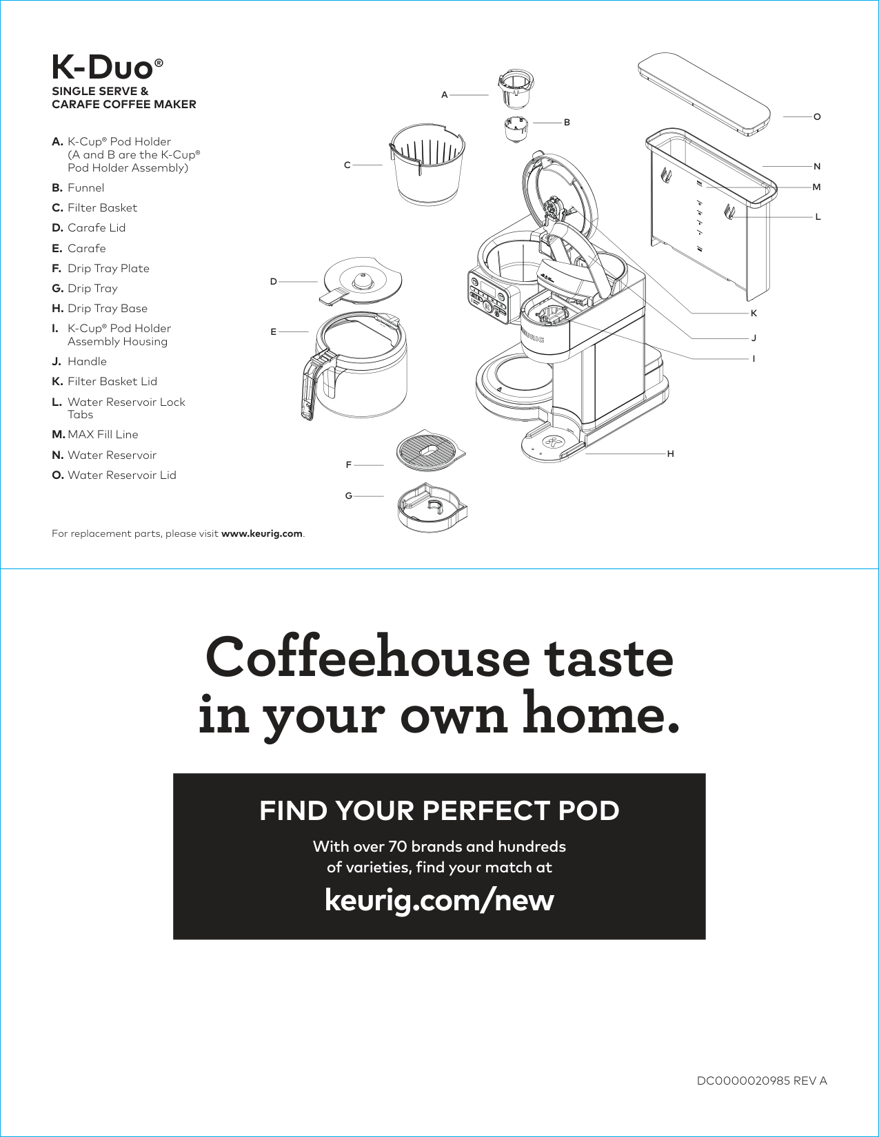 A. K-Cup® Pod Holder(A and B are the K-Cup® Pod Holder Assembly) B. Funnel C. Filter Basket D. Carafe Lid E. Carafe F. Drip Tray Plate G. Drip Tray H. Drip Tray Base I. K-Cup® Pod Holder Assembly Housing J. Handle K. Filter Basket Lid L. Water Reservoir Lock Tabs M. MAX Fill Line N. Water Reservoir O. Water Reservoir Lid For replacement parts, please visit www.keurig.com.