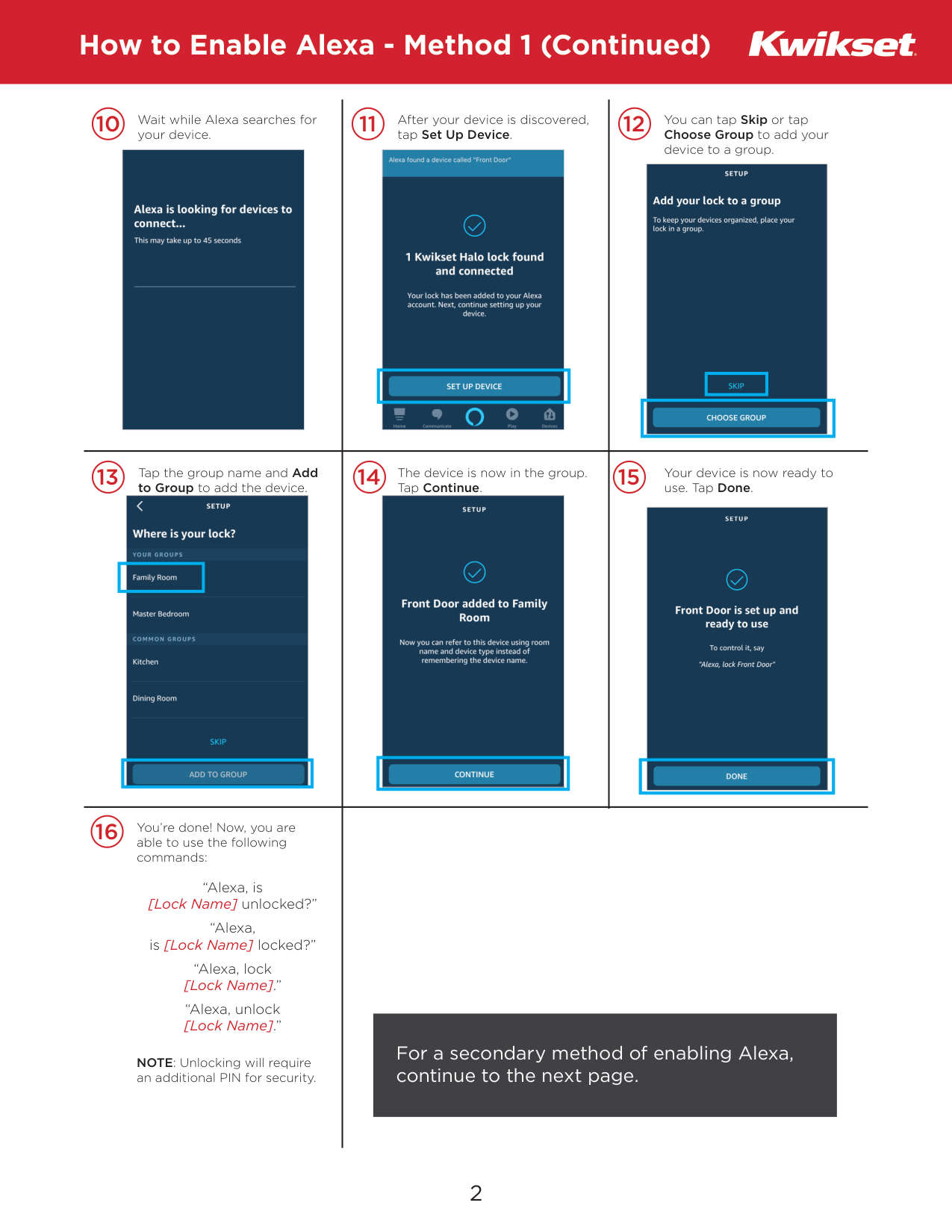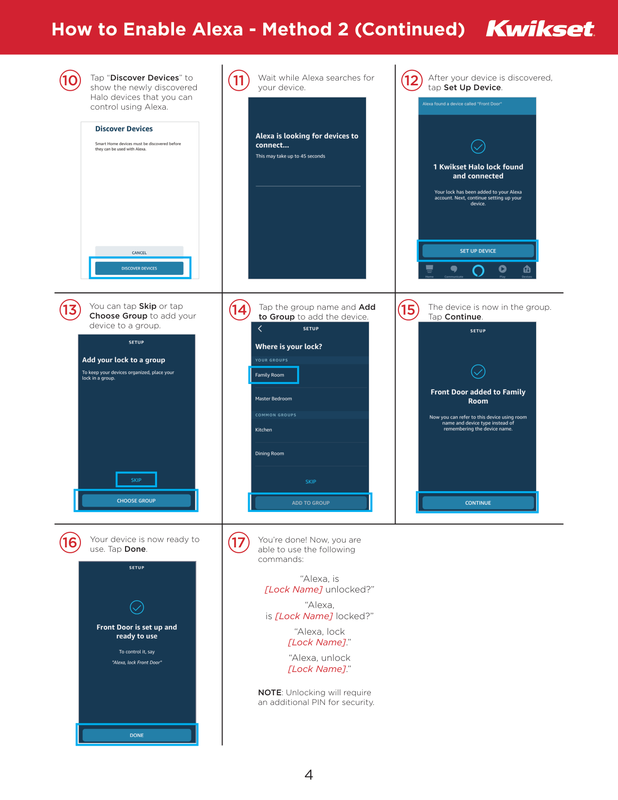 How to Enable Alexa Voice Control On your Android or iOS device, open the Alexa app. 1 Tap on the hamburger menu. 2 Tap on Skills and Games. 3 Search for “Kwikset Smart Home” and tap on it. Tap the search icon on the upper right of the screen. When the accounting linking is complete, tap the X in the top right corner to continue to device discovery. 4 7 Tap Enable to Use. 5 On the account linking page, enter your Kwikset app username and password, then tap Sign In. 6 Tap “Discover Devices” to show the newly discovered Halo devices that you can control using Alexa. 8 9 Continue to the next page for additional steps. 1 There are two ways to enable Alexa voice control of your Kwikset Halo Smart Lock: Method 1 - Linking the Kwikset Smart Home skill Method 2 - Adding a lock to your Alexa account (page 3) Method 1 - Linking the Kwikset Smart Home skill