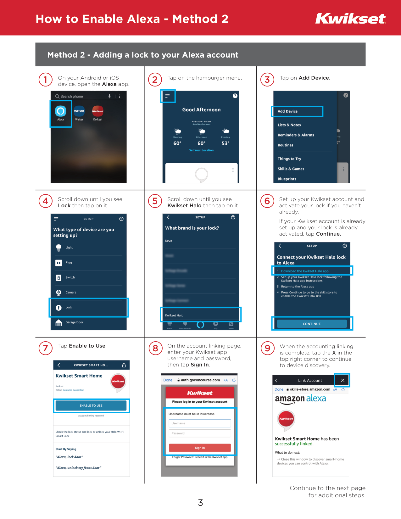 How to Enable Alexa - Method 2 On your Android or iOS device, open the Alexa app. 1 Tap on the hamburger menu. 2 Tap on Add Device. 3 Scroll down until you see Lock then tap on it. When the accounting linking is complete, tap the X in the top right corner to continue to device discovery. 4 7 Scroll down until you see Kwikset Halo then tap on it. Set up your Kwikset account and activate your lock if you haven’t already. If your Kwikset account is already set up and your lock is already activated, tap Continue. 5 On the account linking page, enter your Kwikset app username and password, then tap Sign In. 6 8 9 Tap Enable to Use. Continue to the next page for additional steps. 3 Method 2 - Adding a lock to your Alexa account