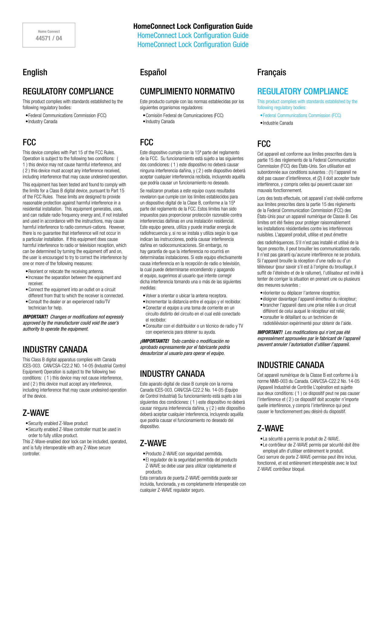 A (x1) A (x1) A (x4) B (x9) Inclusion Inclusión Inclusion HomeConnect Lock Type HomeConnect Lock Type HomeConnect Lock Type Z-Wave Zigbee Exclusion Exclusión Exclusion Inclusion/Exclusion Configuration Process for HomeConnect Locks Inclusion/Exclusion Configuration Process for HomeConnect Locks Inclusion/Exclusion Configuration Process for HomeConnect Locks Fig. 1 Fig. 2HomeConnect Lock Configuration Guide HomeConnect Lock Configuration Guide HomeConnect Lock Configuration Guide Home Connect 44571 / 04 English