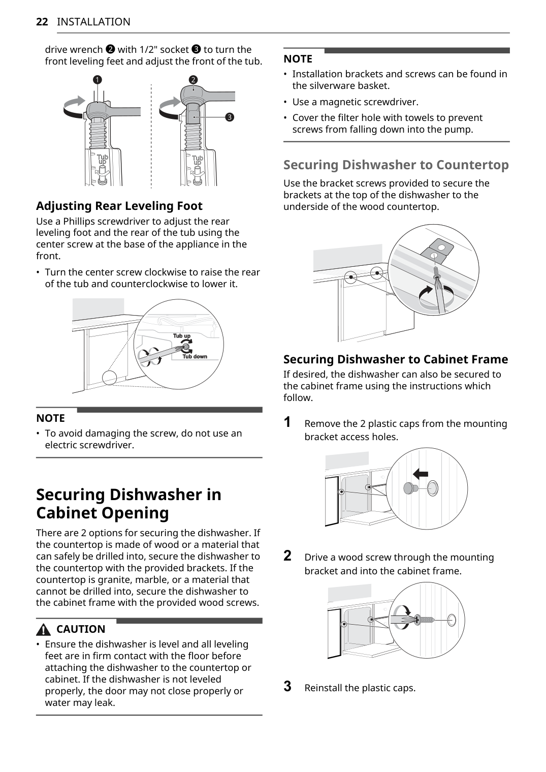 drive wrench b with 1/2" socket c to turn the front leveling feet and adjust the front of the tub. Adjusting Rear Leveling Foot Use a Phillips screwdriver to adjust the rear leveling foot and the rear of the tub using the center screw at the base of the appliance in the front.Note