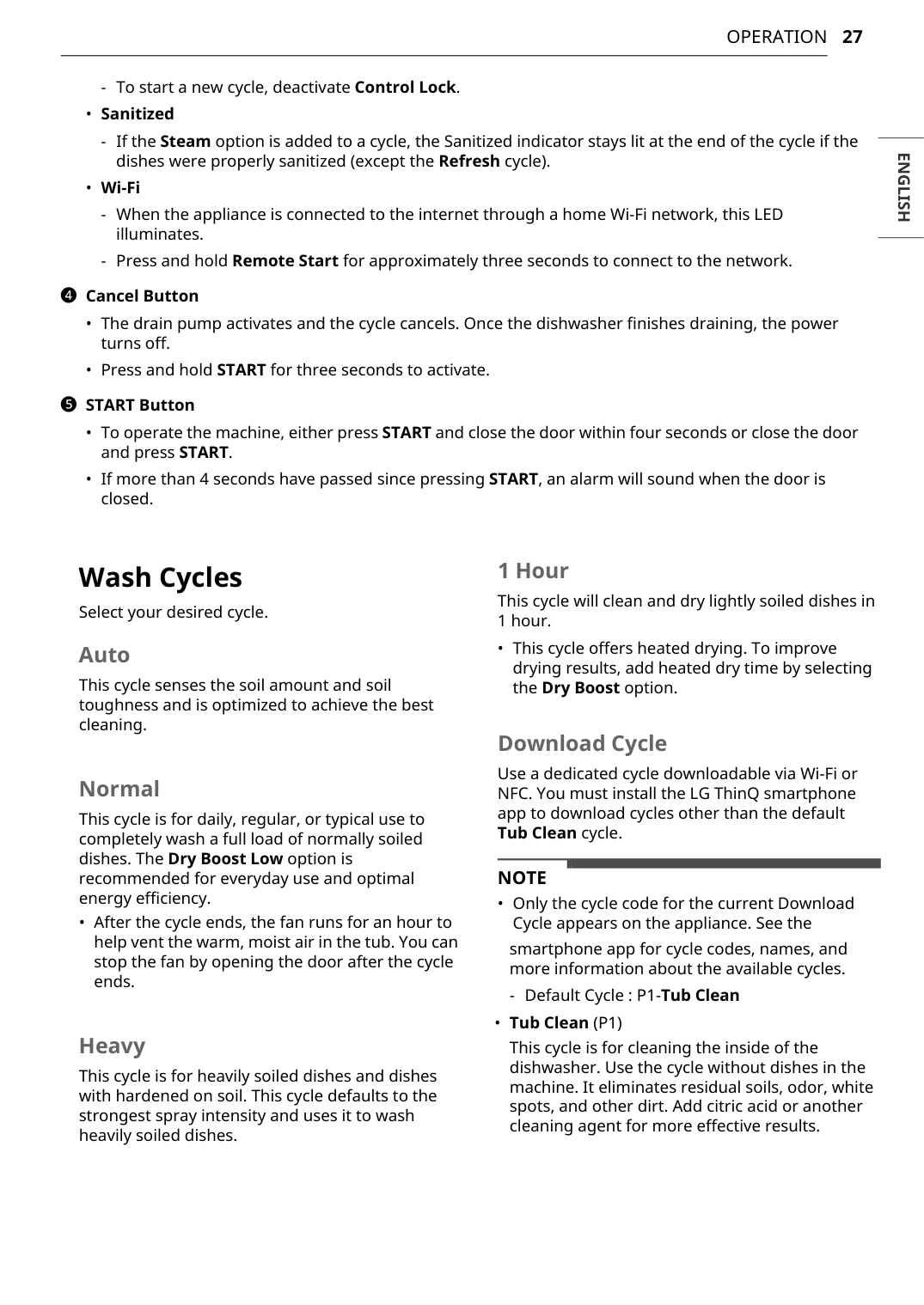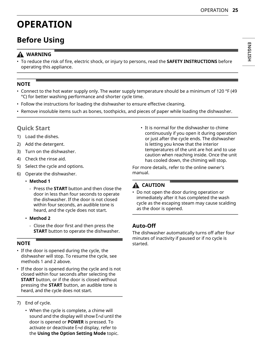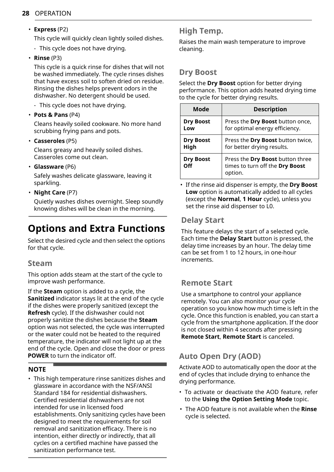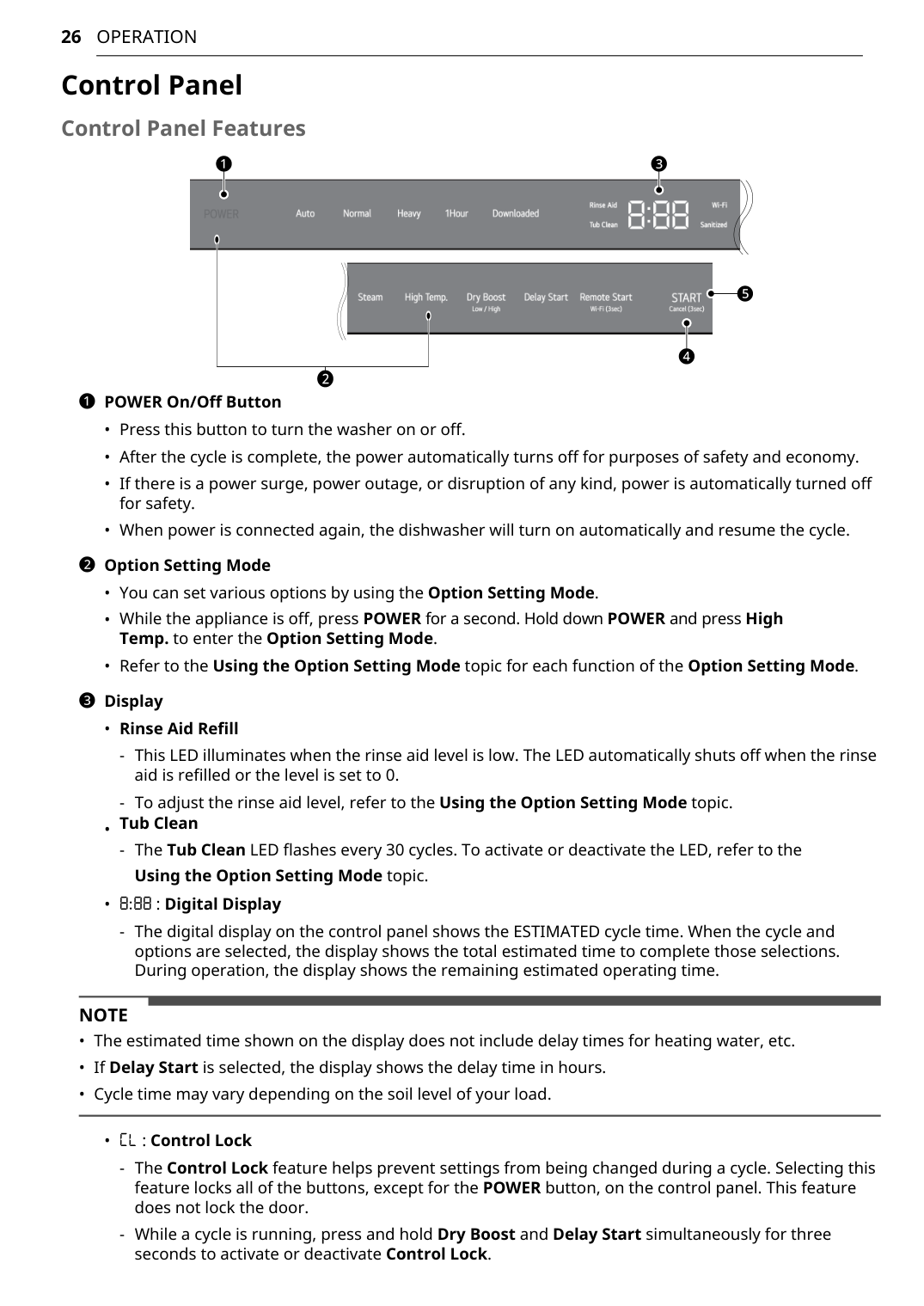 Cycle/Option Guide The cycle guide shows the available options for each cycle. To see the Cycle/Option Guide, refer to the online owner's manual. Using the Option Setting Mode You can set various options by using the Option Setting Mode. 1 Ensure the appliance is off. 2 Press POWER a for one second and the panel will light on. 4 Refer to the table to set up each function. 5 Press START c to save. Function Button Display Tub Clean Reminder Off & On Rinse Aid Level Dry BoostL2 ~ L3 ~ L4 ~ L0