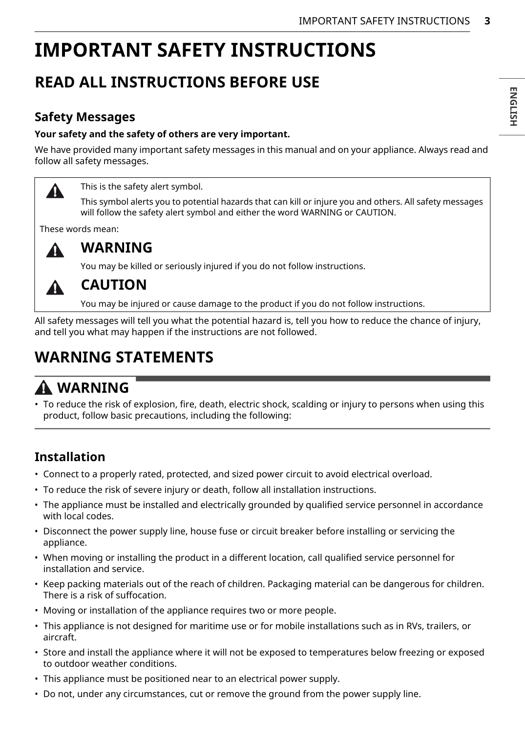 Safety Messages Your safety and the safety of others are very important. We have provided many important safety messages in this manual and on your appliance. Always read and follow all safety messages. All safety messages will tell you what the potential hazard is, tell you how to reduce the chance of injury, and tell you what may happen if the instructions are not followed.Warning Statements