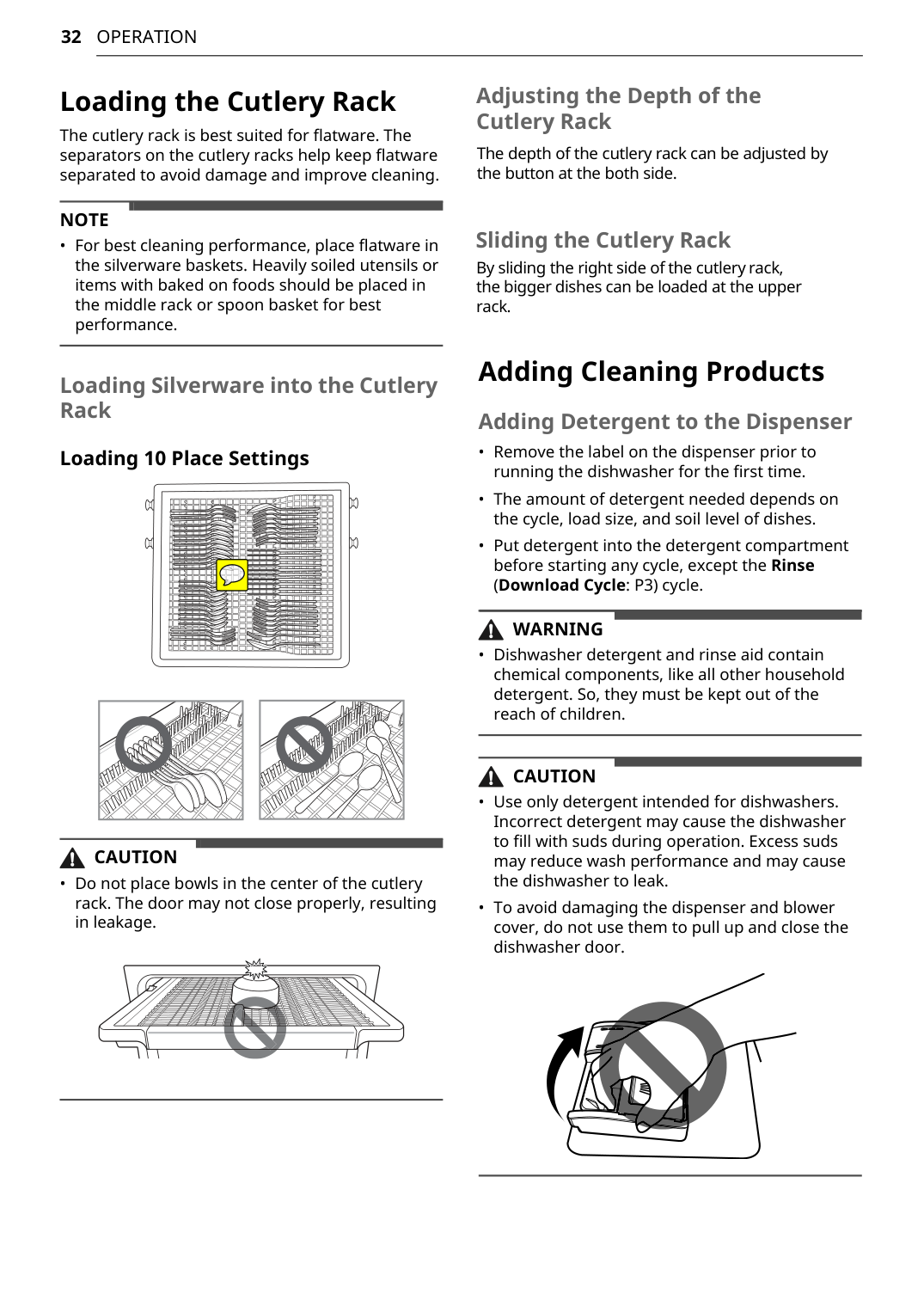 25 Before Using 26 Control Panel 27 Wash Cycles 28 Options and Extra Functions 30 Loading the Dishwasher 30 Loading the Silverware Basket 31 Loading the Lower Rack 32 Loading the Upper Rack 32 Loading the Cutlery Rack 33 Adding Cleaning Products35 Smart Functions