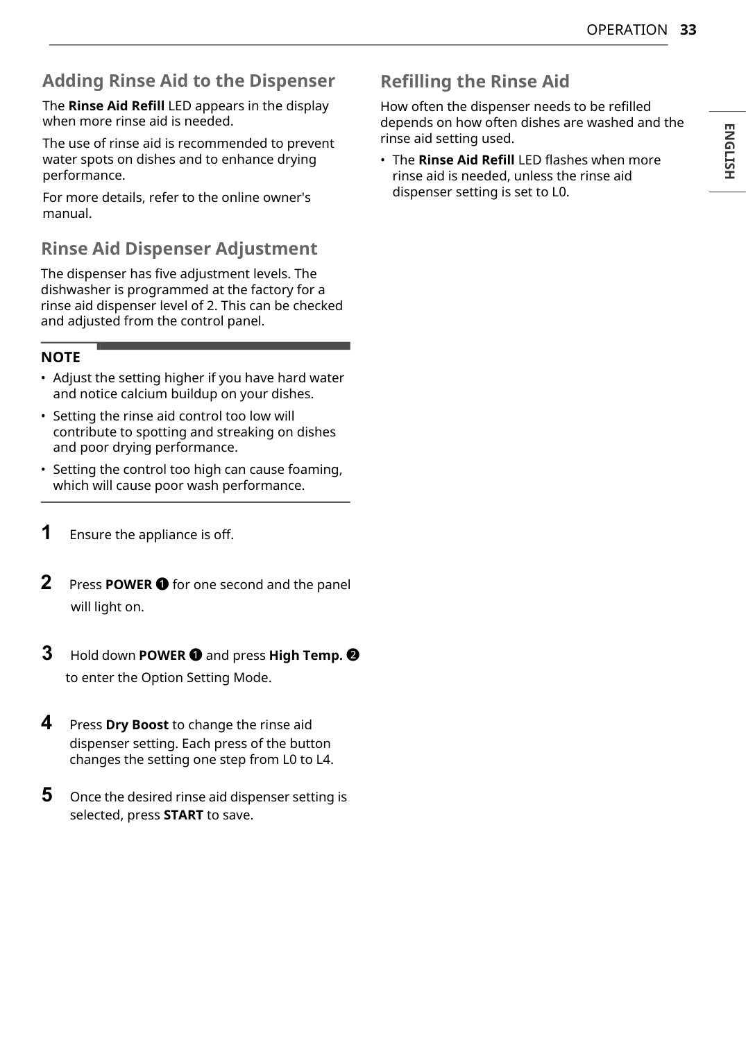 Adding Rinse Aid to the Dispenser The Rinse Aid Refill LED appears in the display when more rinse aid is needed. The use of rinse aid is recommended to prevent water spots on dishes and to enhance drying performance. For more details, refer to the online owner's manual. Rinse Aid Dispenser Adjustment The dispenser has five adjustment levels. The dishwasher is programmed at the factory for a rinse aid dispenser level of 2. This can be checked and adjusted from the control panel.Note