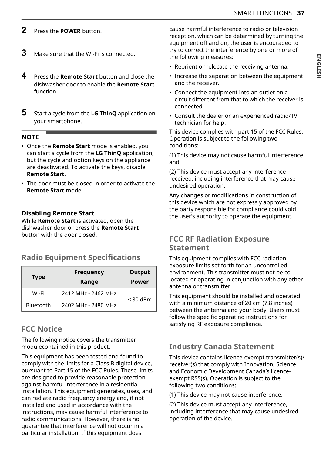 2 Press the POWER button. 3 Make sure that the Wi-Fi is connected. 4 Press the Remote Start button and close the dishwasher door to enable the Remote Start function. 5 Start a cycle from the LG ThinQ application on your smartphone.Note